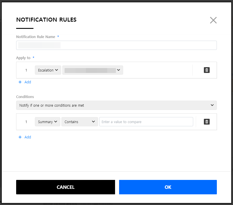 | Conditions details - 1 | Choose Summary and enter text or numbers to be included in the incident’s name. For example, when you choose the Summary and Contains as an operator, and enter ‘Test’, you will receive notifications about incident’s name with Test. Available Operators: Equal, Not Equal, Greater Than, Greater or Equal, Less Than, Less or Equal, Contains, Not Contains, Starts with, Not Starts with, Ends with, Not Ends with |