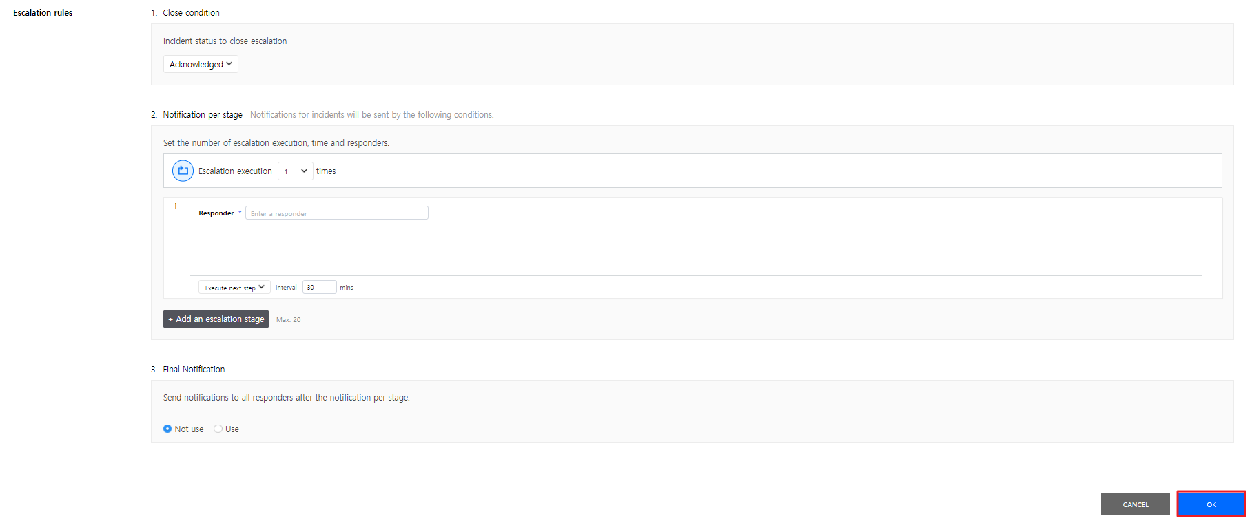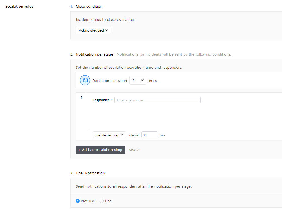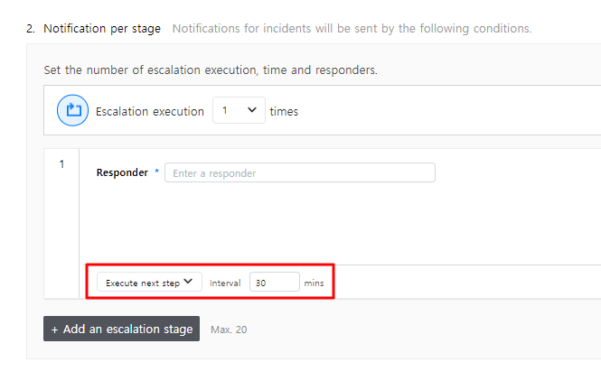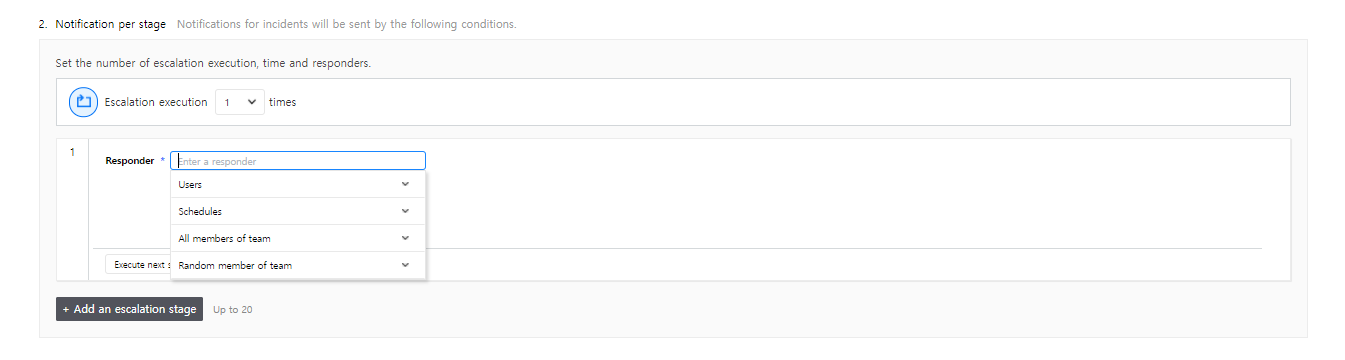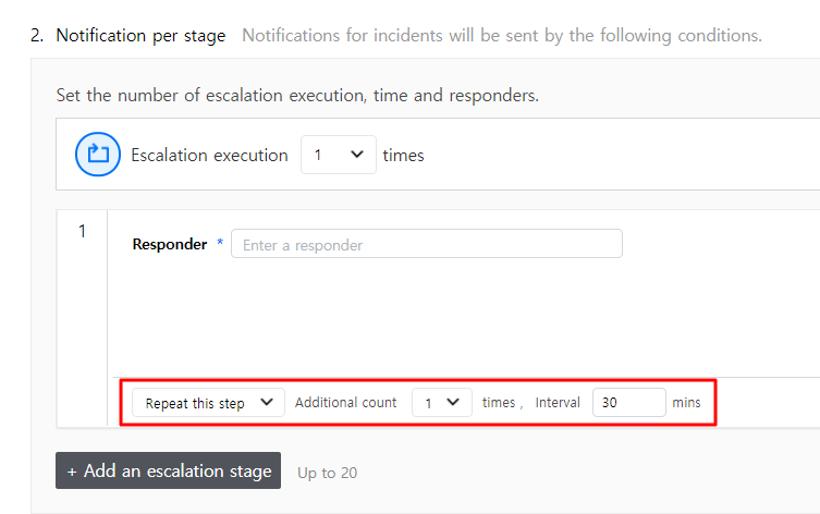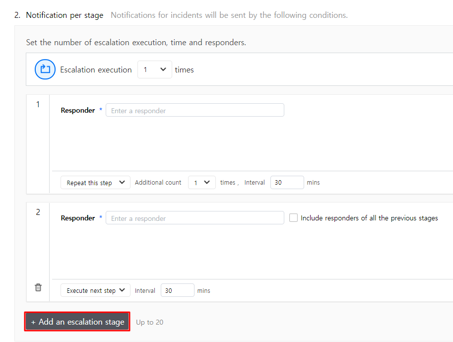 Click [Add an escalation stage] to add an escalation step. A maximum of 20 steps can be added, and each escalation step can be repeated as well. When you select the [Include responders of all the previous stages] checkbox, you can send notifications to all responders of all the previous stages.