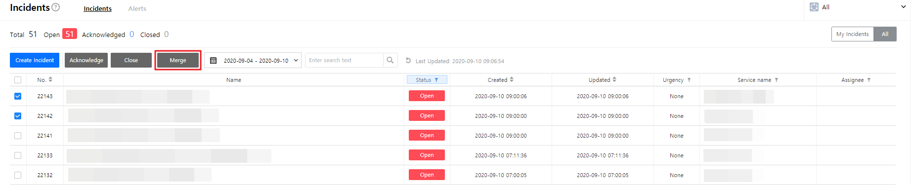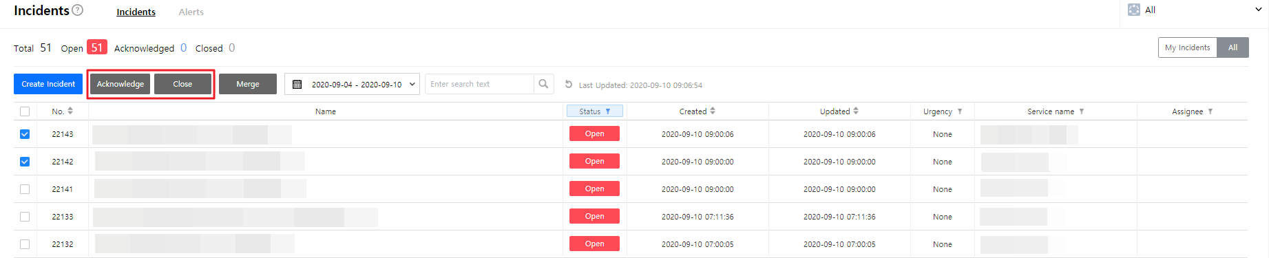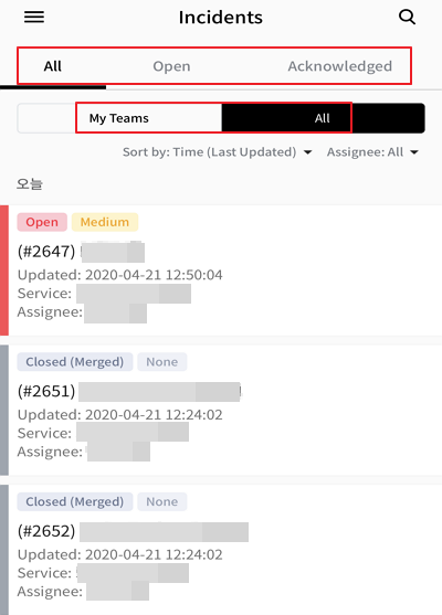 ⑤ After login, you can see incidents. The All tab shows all open and acknowledged incidents in the account. The Open tab shows open incidents only, and you can filter incidents by My Team. You can also see incidents that are assigned to your teams.
