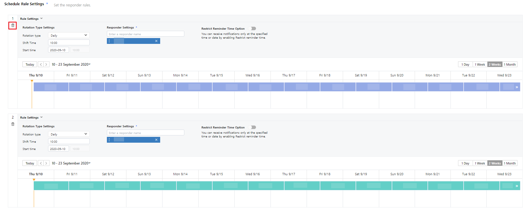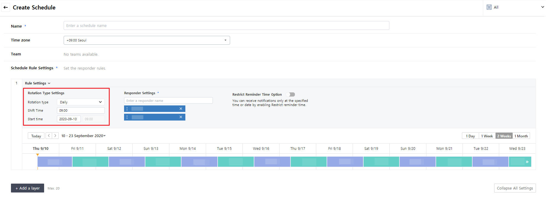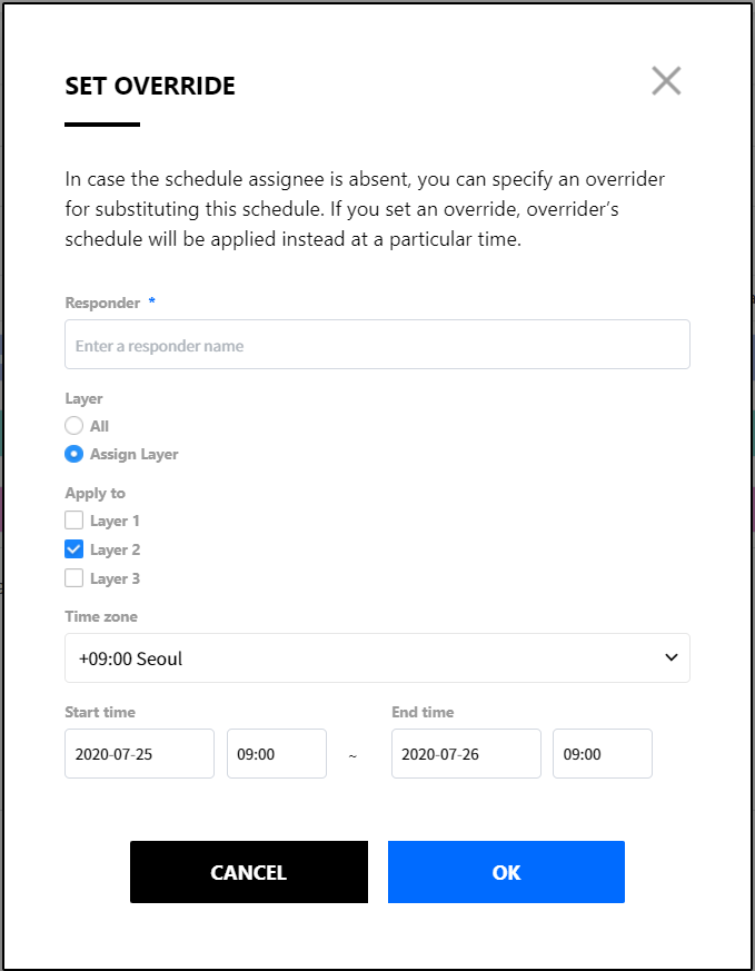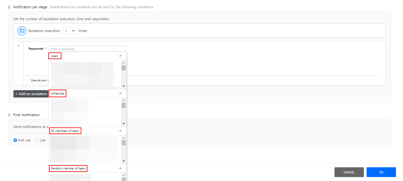 In a responder input field, enter names of responders. Responders can be set as Schedules, Users, All members of team, and/or Radom member of team, and multiple items can be selected.