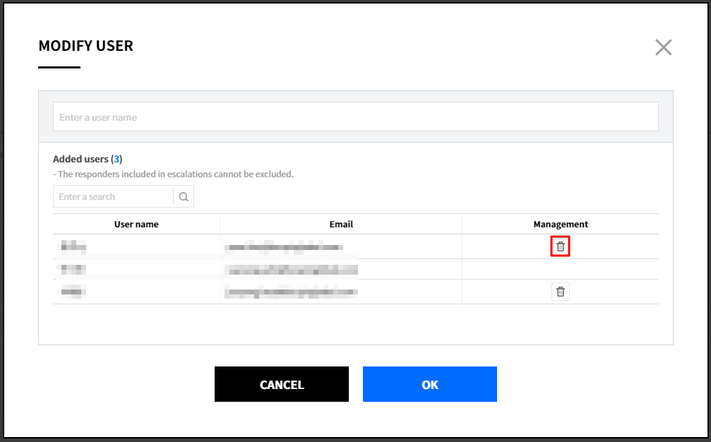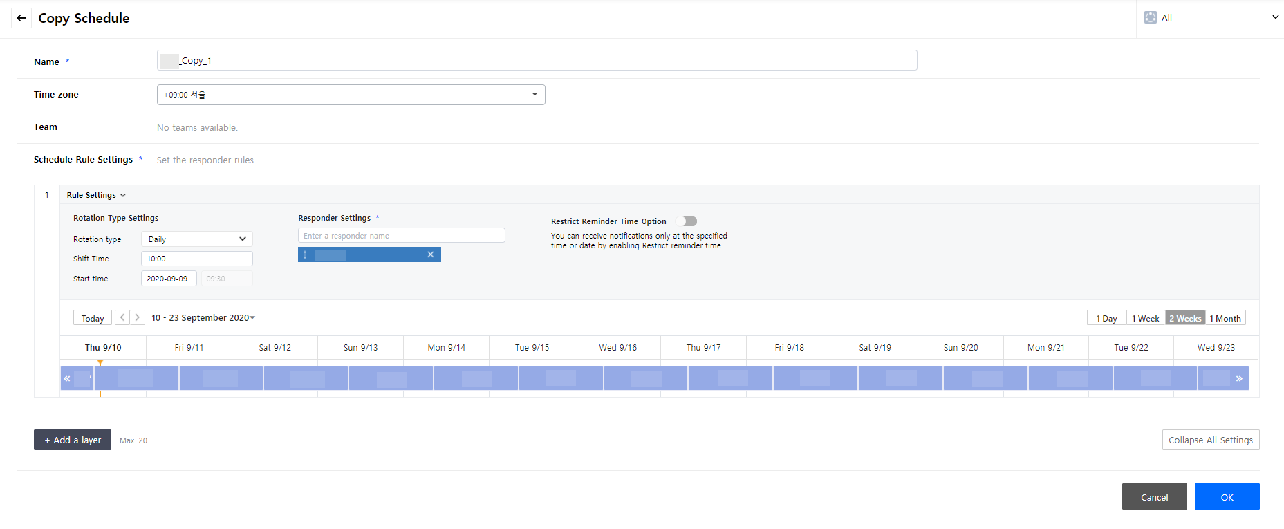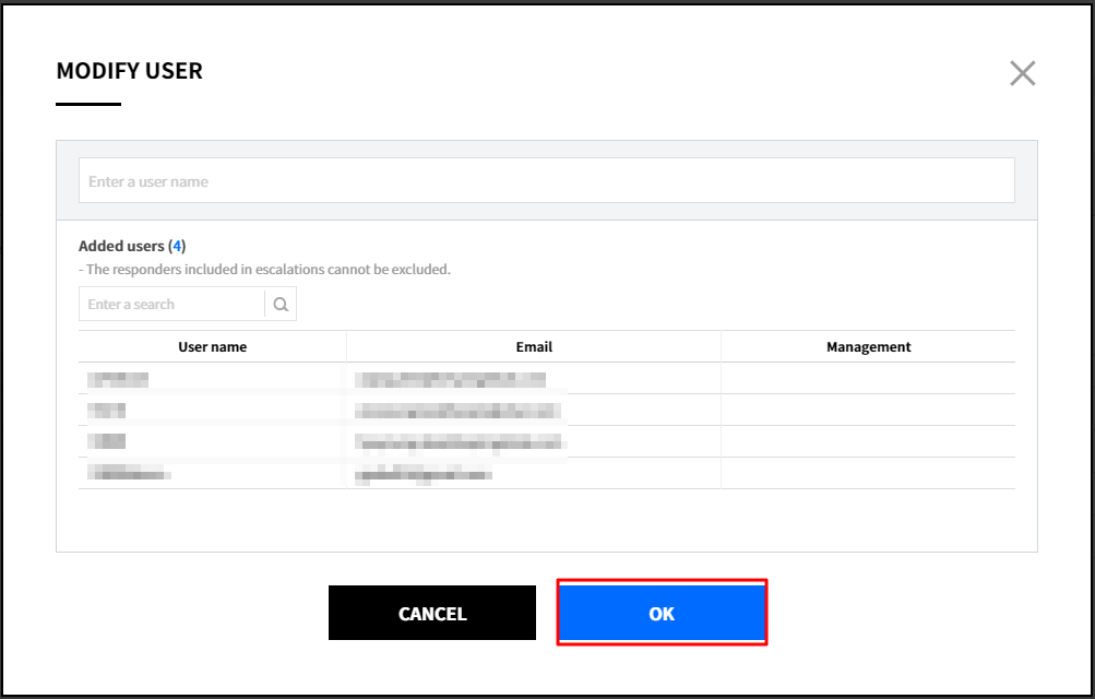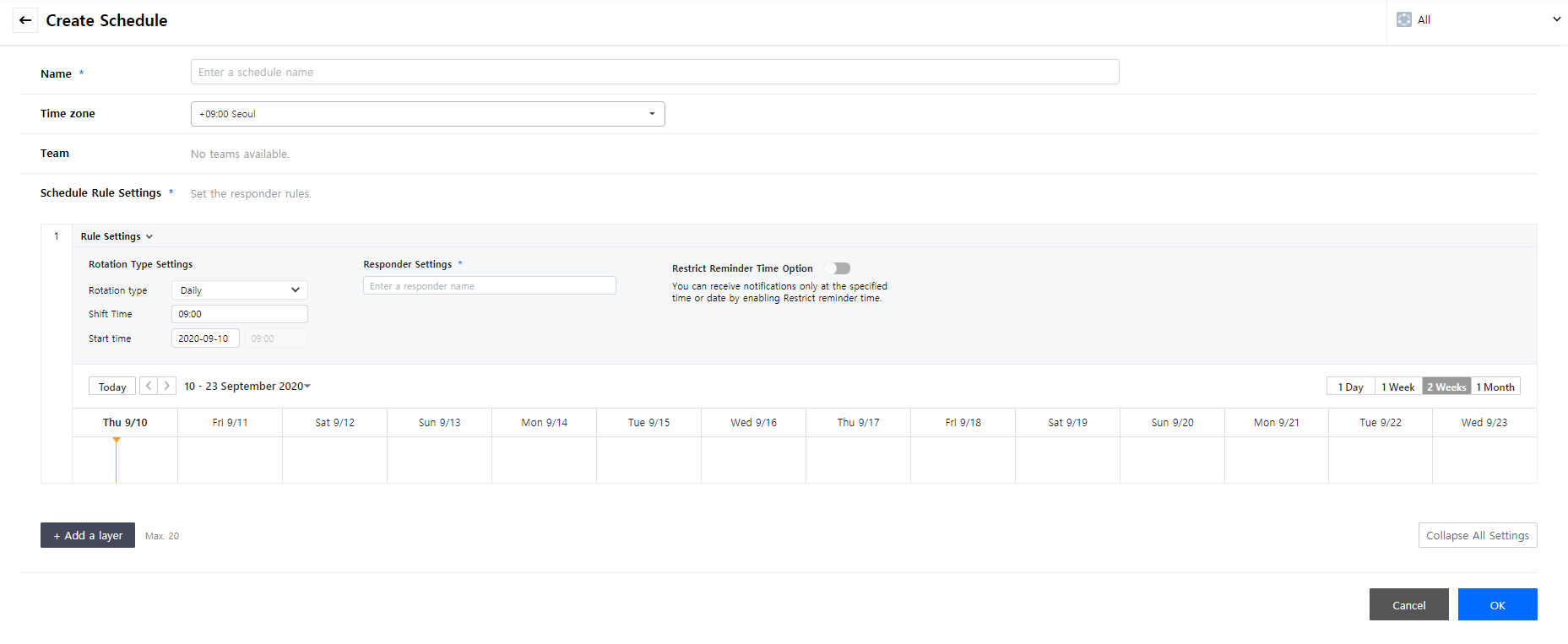 In a responder input field, enter names of responders. Responders can be set as Schedules, Users, All members of team, and/or Radom member of team, and multiple items can be selected.