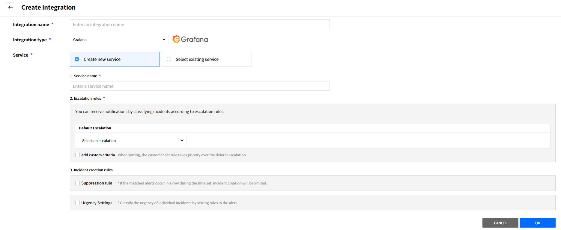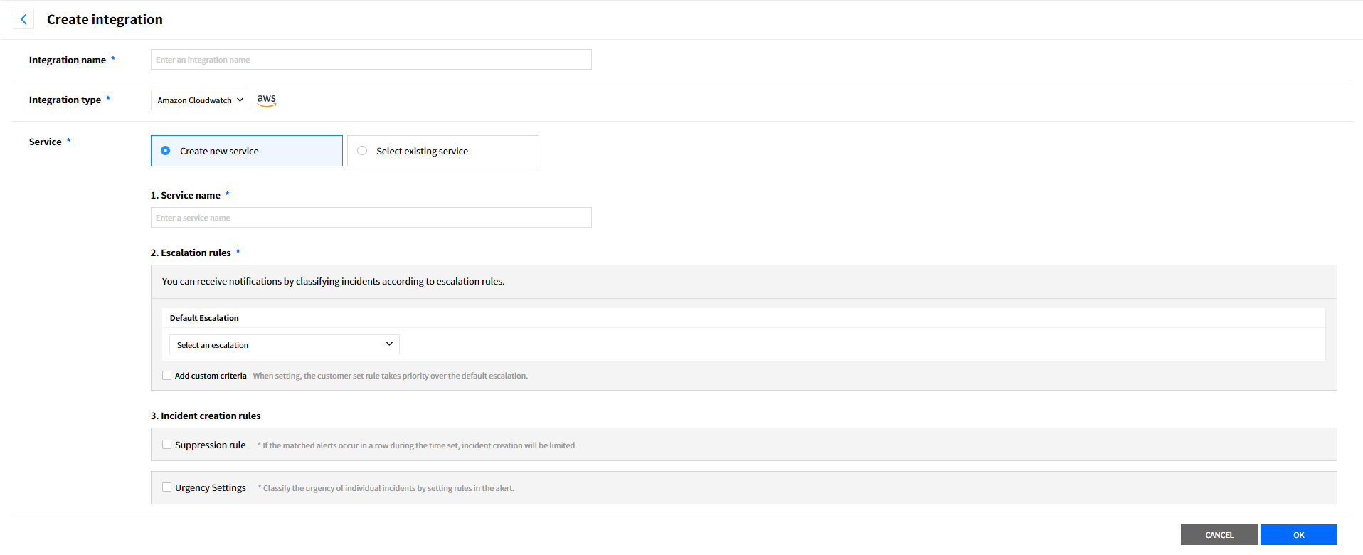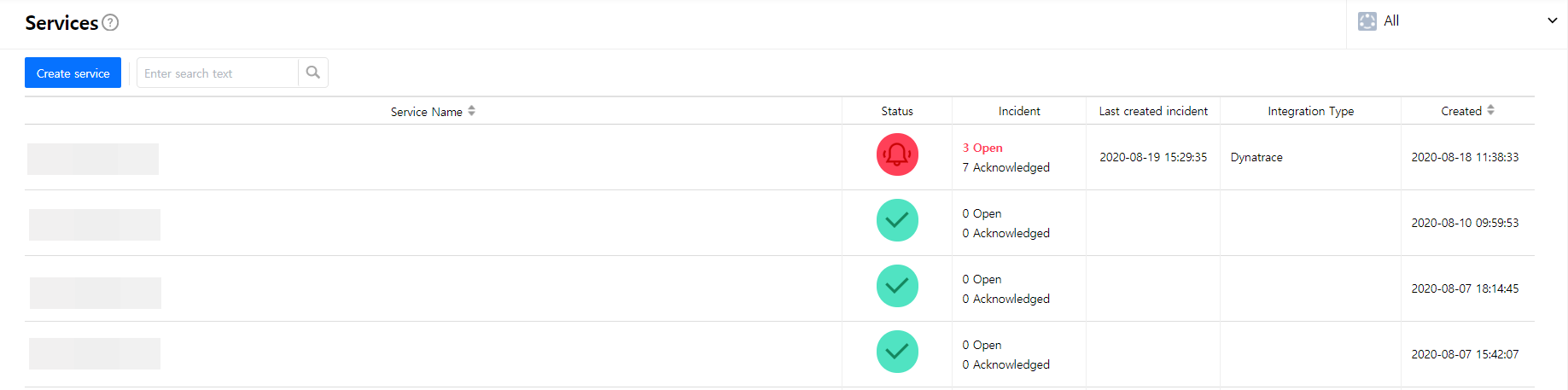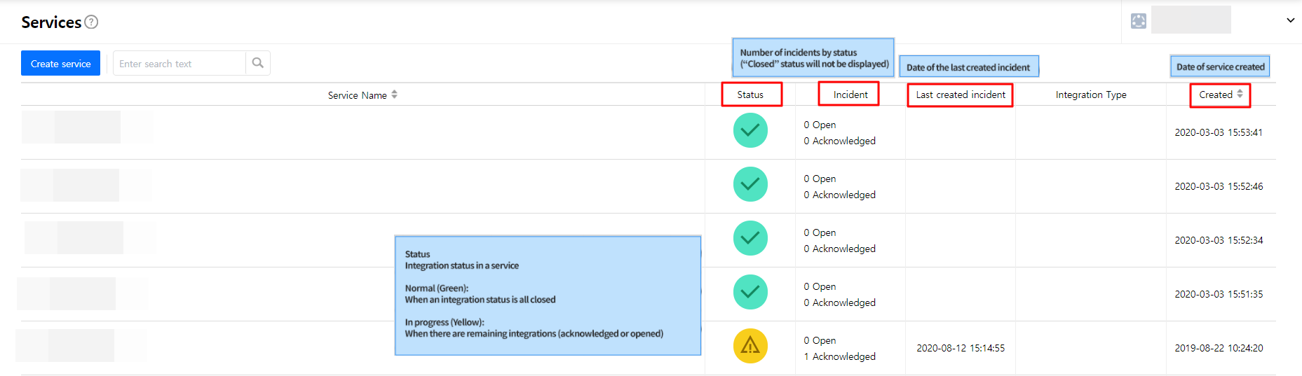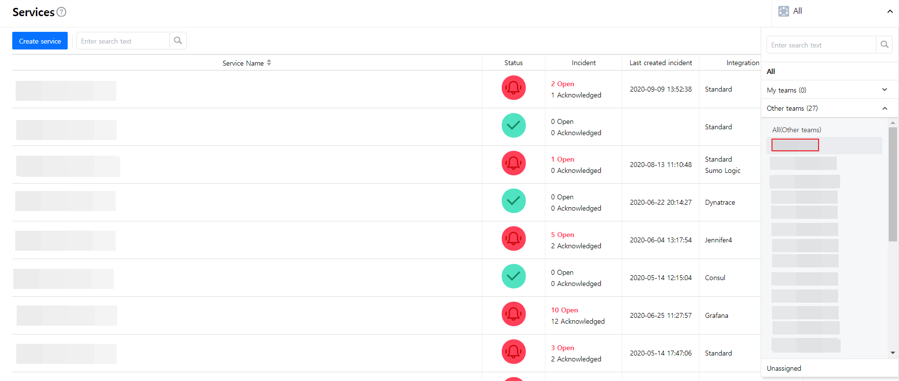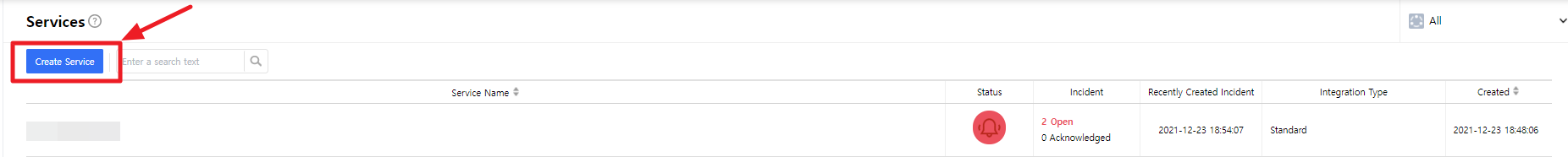 Create a service to manage incidents that are created in the integration. Service is a unit for managing incidents and provides related information that easily allows users to view and access incidents, integrations, escalation rules, extension, maintenance history they need to manage incidents. So you can create and use a service to reflect your needs.
