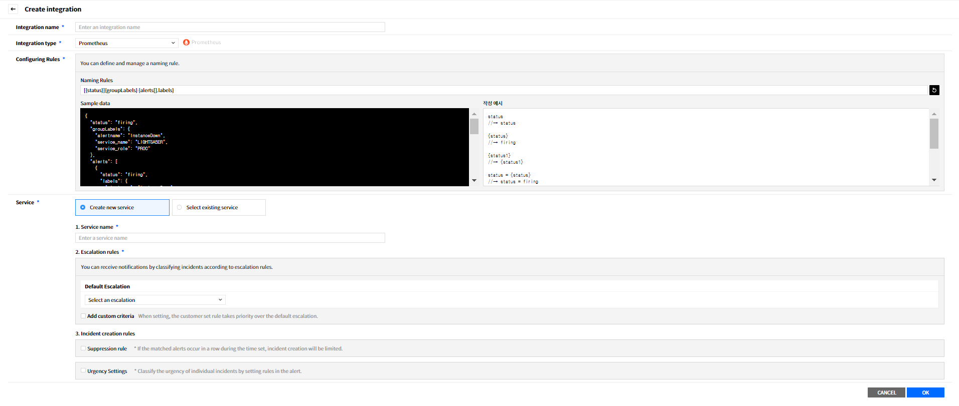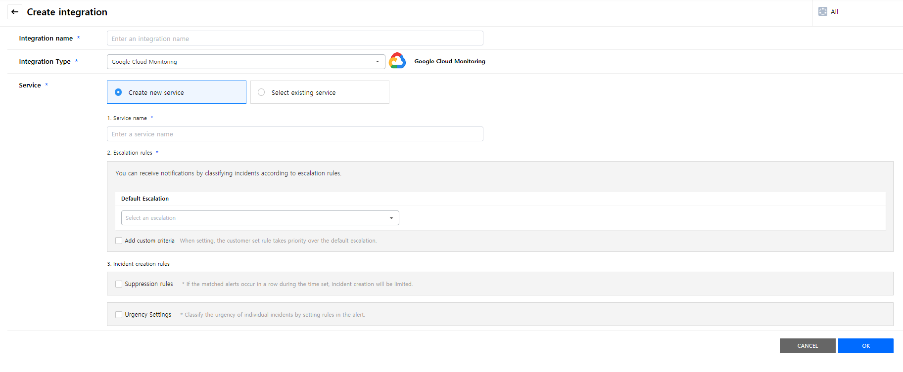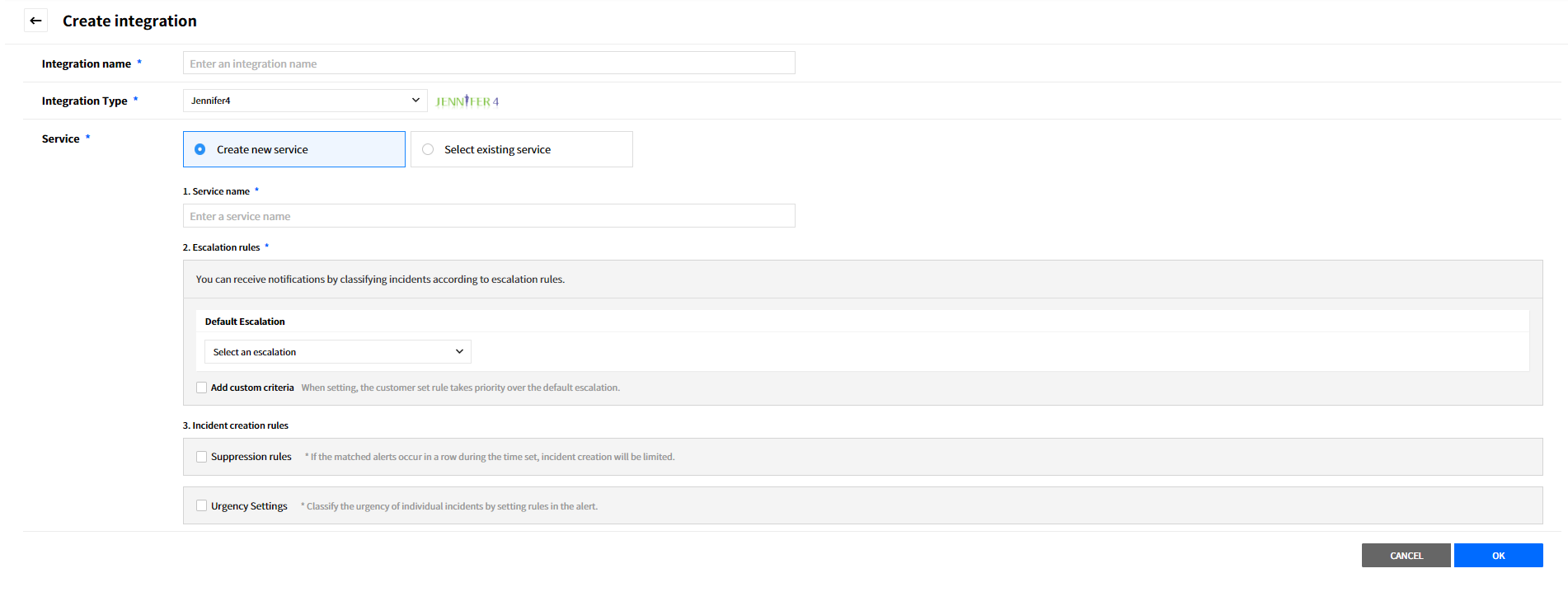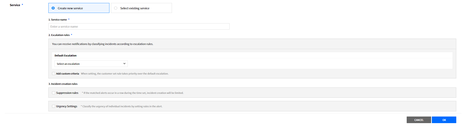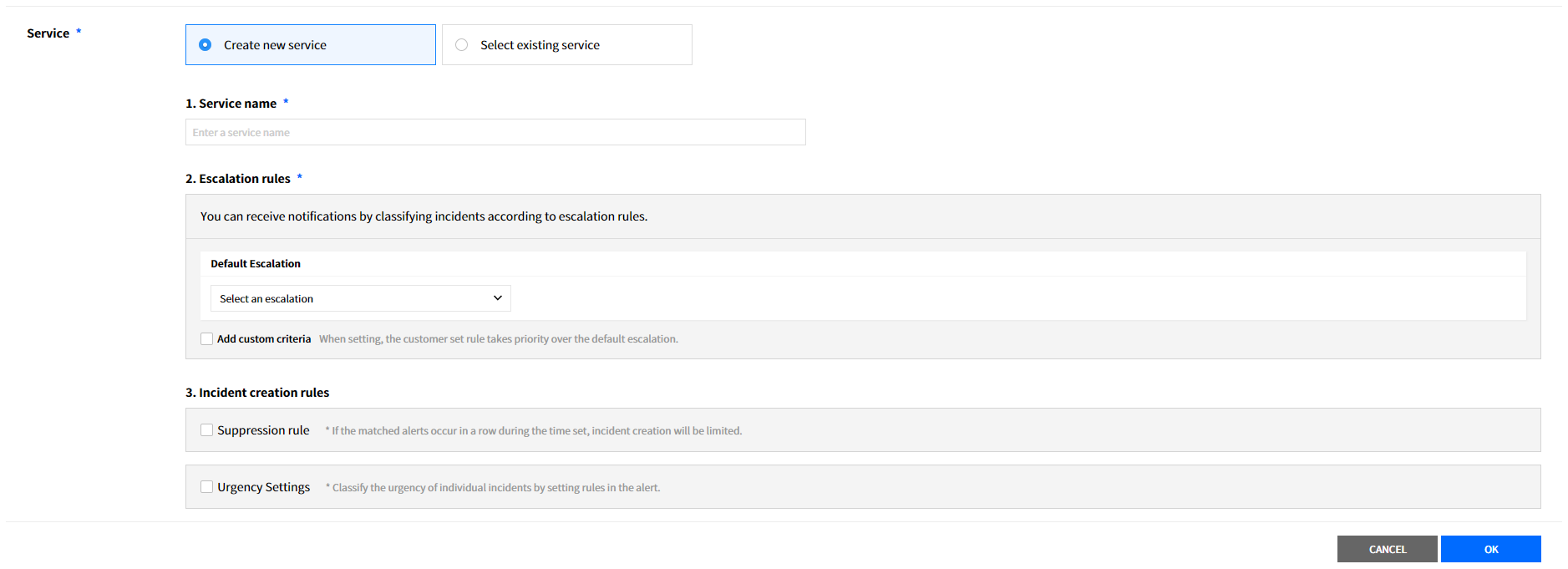 Create a service to manage incidents that are created in the integration. Service is a unit for managing incidents and provides related information that easily allows users to view and access incidents, integrations, escalation rules, extension, maintenance history they need to manage incidents. So you can create and use a service to reflect your needs.