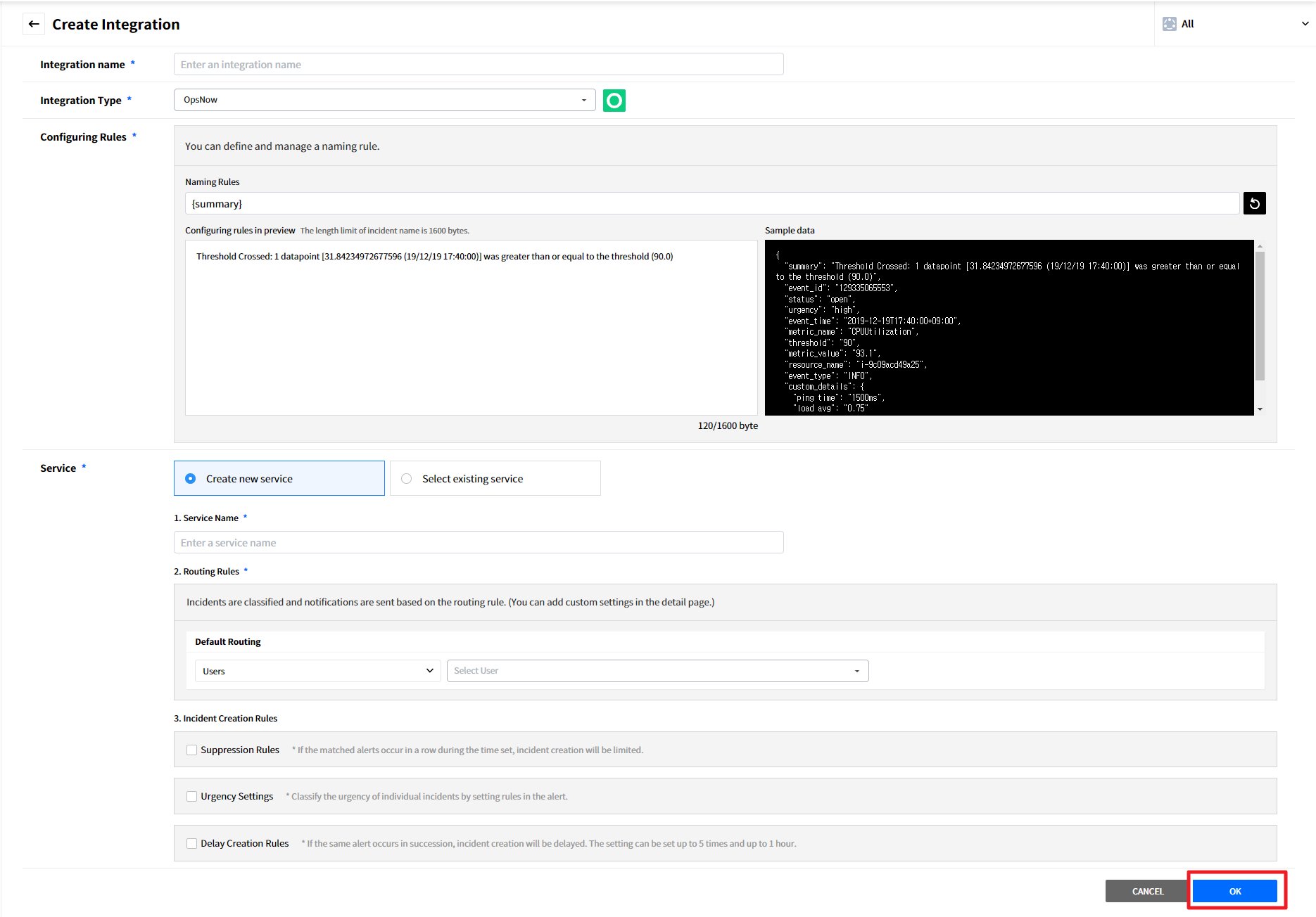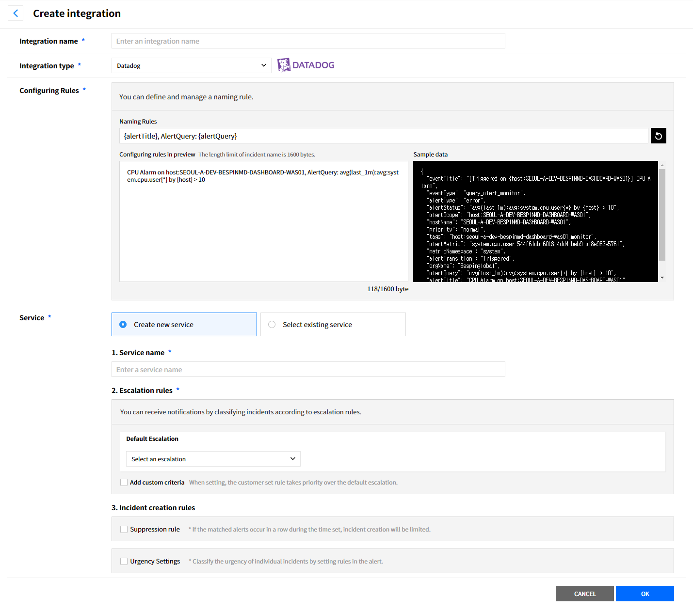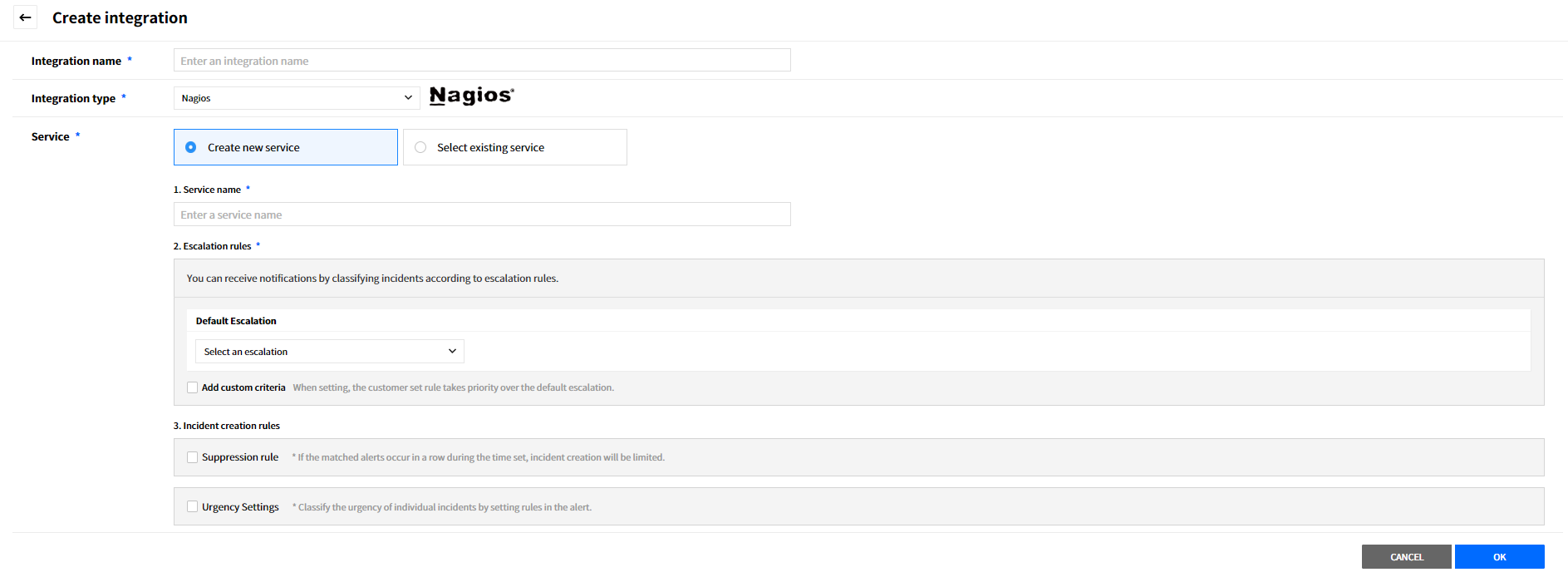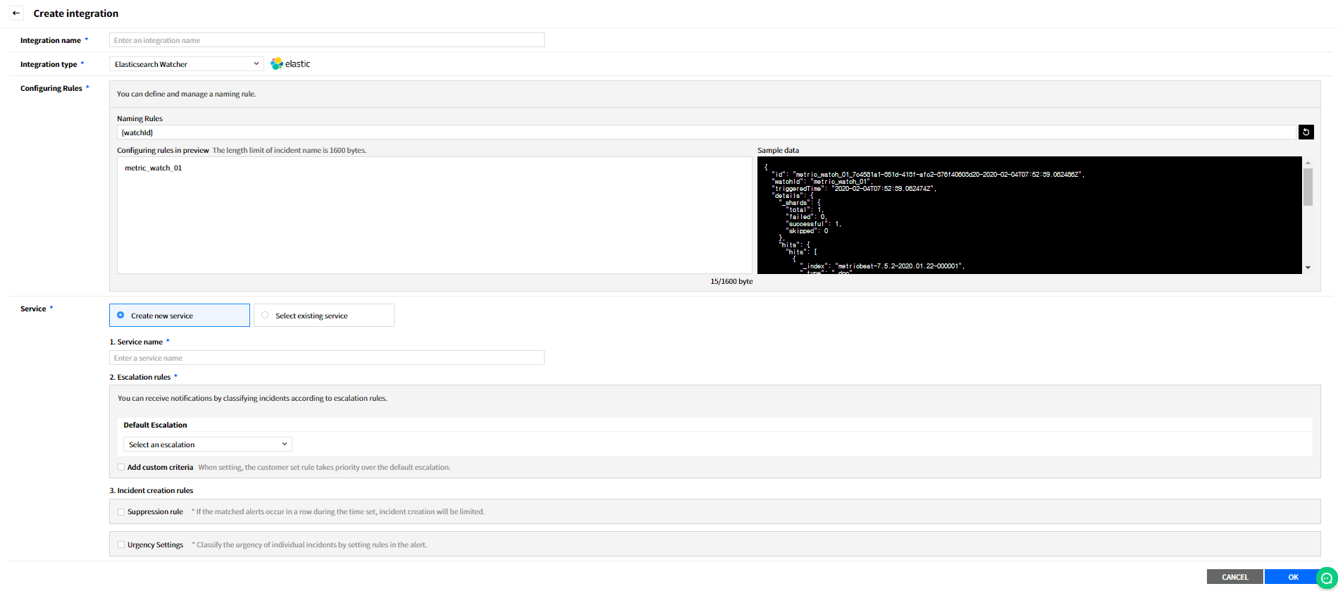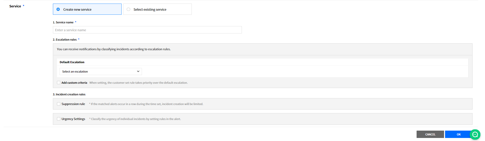 Create a service to manage incidents that are created in the integration. Service is a unit for managing incidents and provides related information that easily allows users to view and access incidents, integrations, escalation rules, extension, maintenance history they need to manage incidents. So you can create and use a service to reflect your needs.