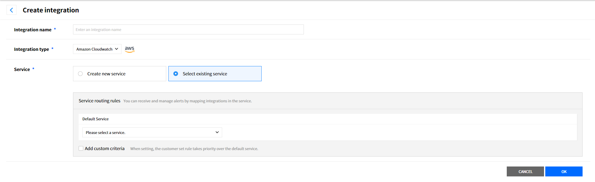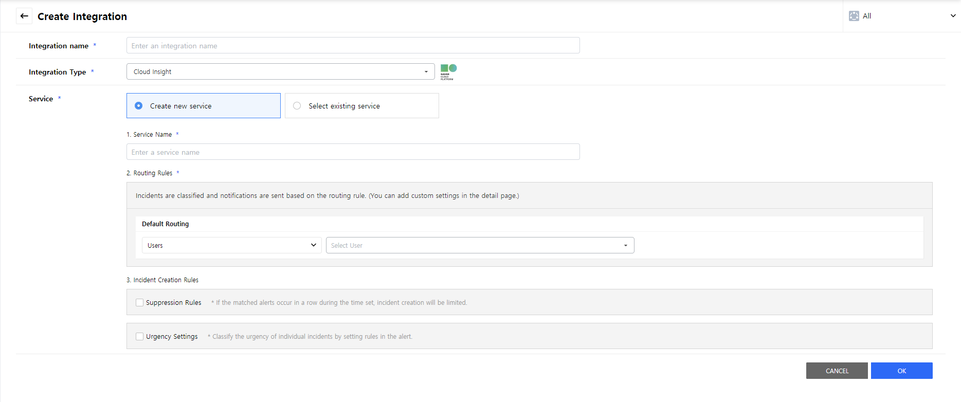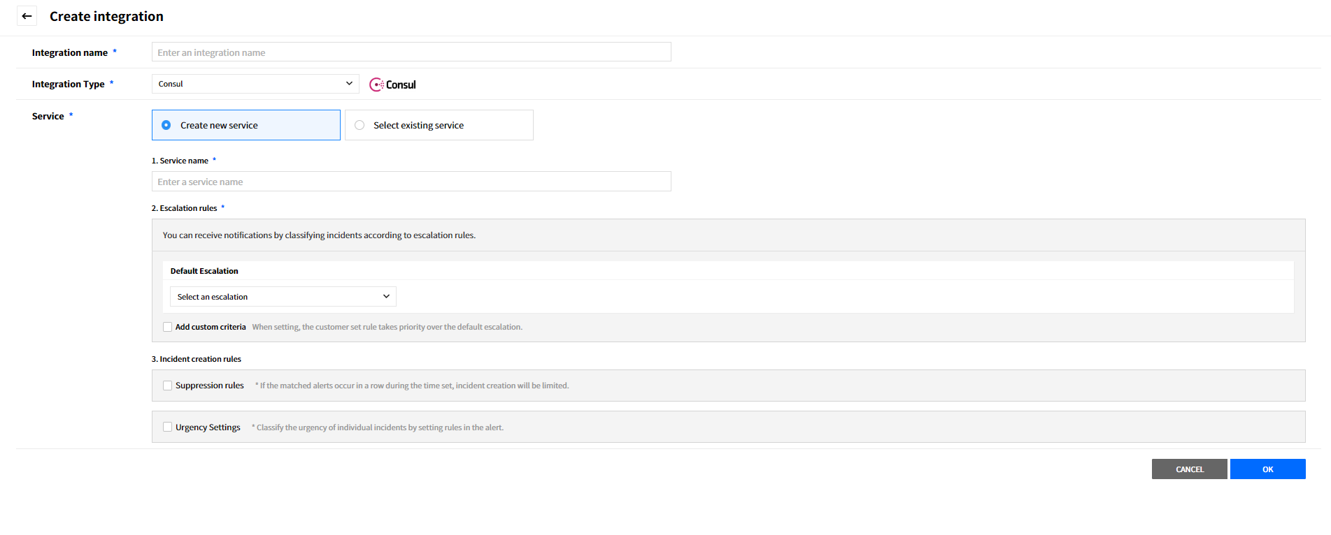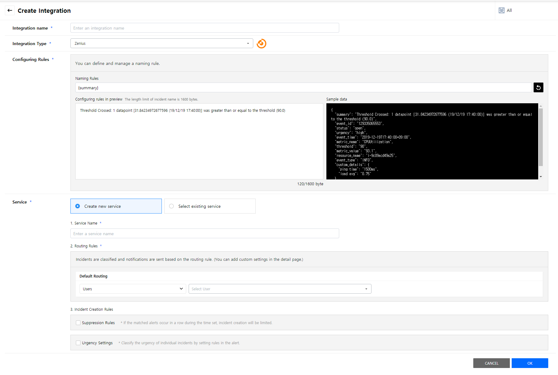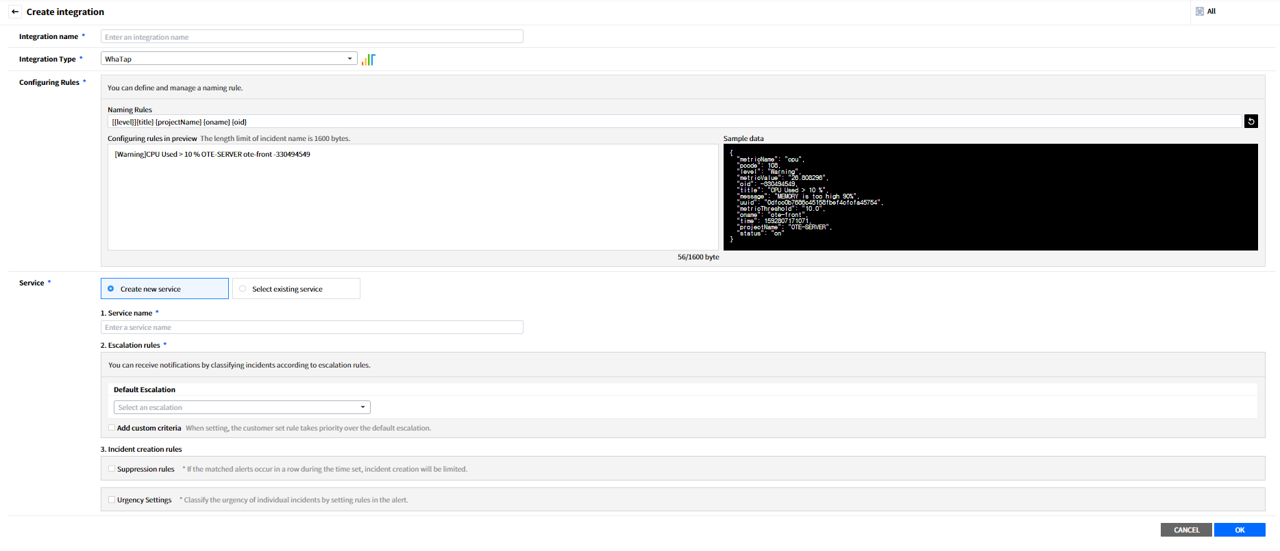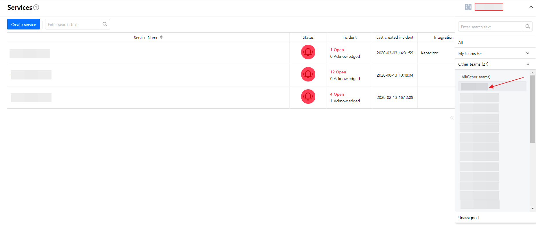 Create a service to manage incidents that are created in the integration. Service is a unit for managing incidents and provides related information that easily allows users to view and access incidents, integrations, escalation rules, extension, maintenance history they need to manage incidents. So you can create and use a service to reflect your needs.