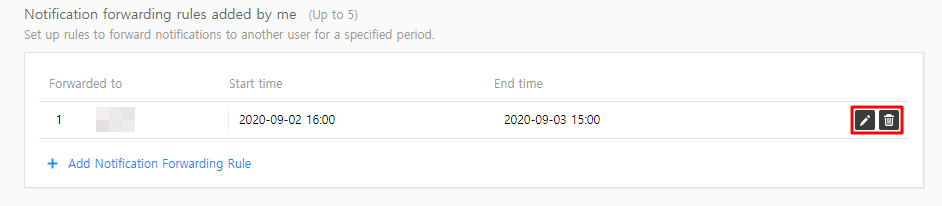 If you cannot receive notifications, you can assign other users to receive notifications for you for a specified time period. Click [Notification Forwarding Rule] to specify a responder and start & end times to create a rule.