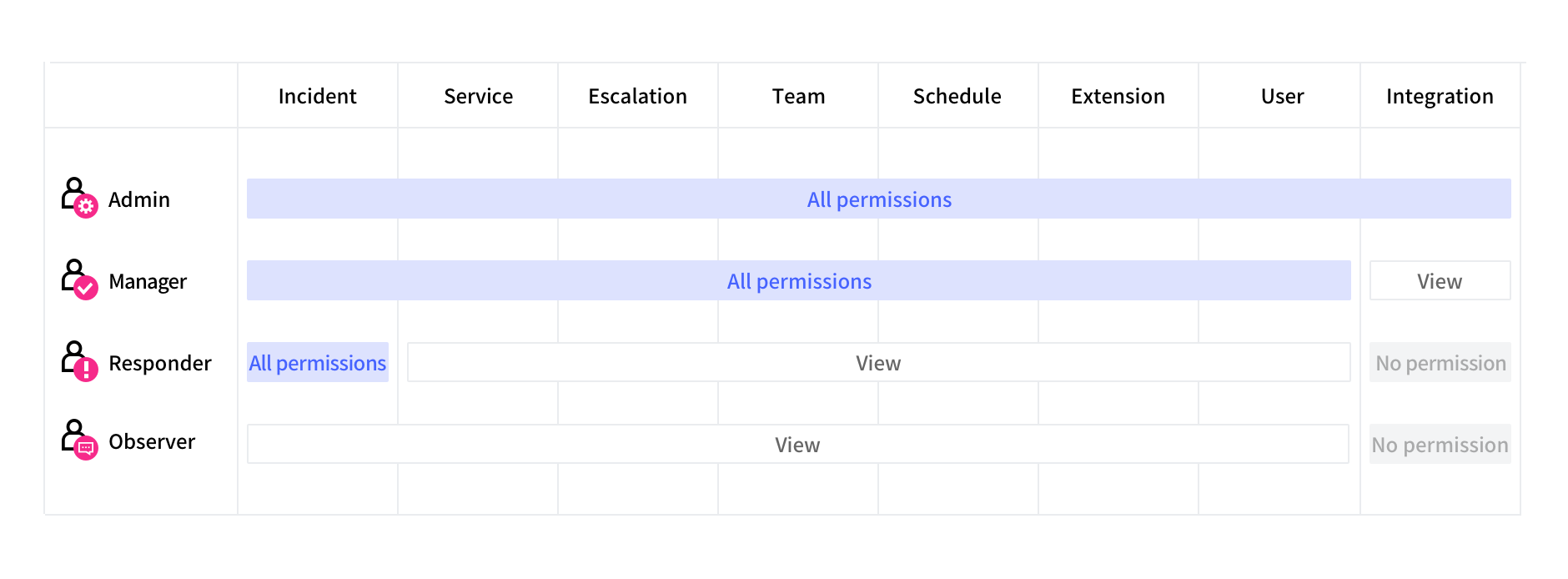| Role | Feature | Integrations | Schedules | Extensions | Teams | Incidents | Services | Escalations | Users |