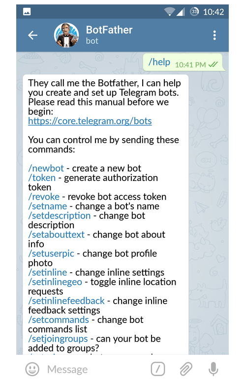 ② In the BotFather channel, enter /help to see a list of commands to manage bots.