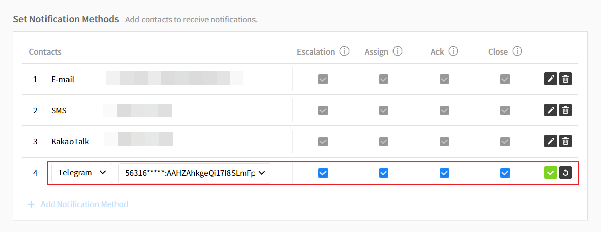⑦ Scroll down to Set Notifications Methods, select Telegram, activate or deactivate notification statuses (Escalation, Assign, Ack, Close) and click