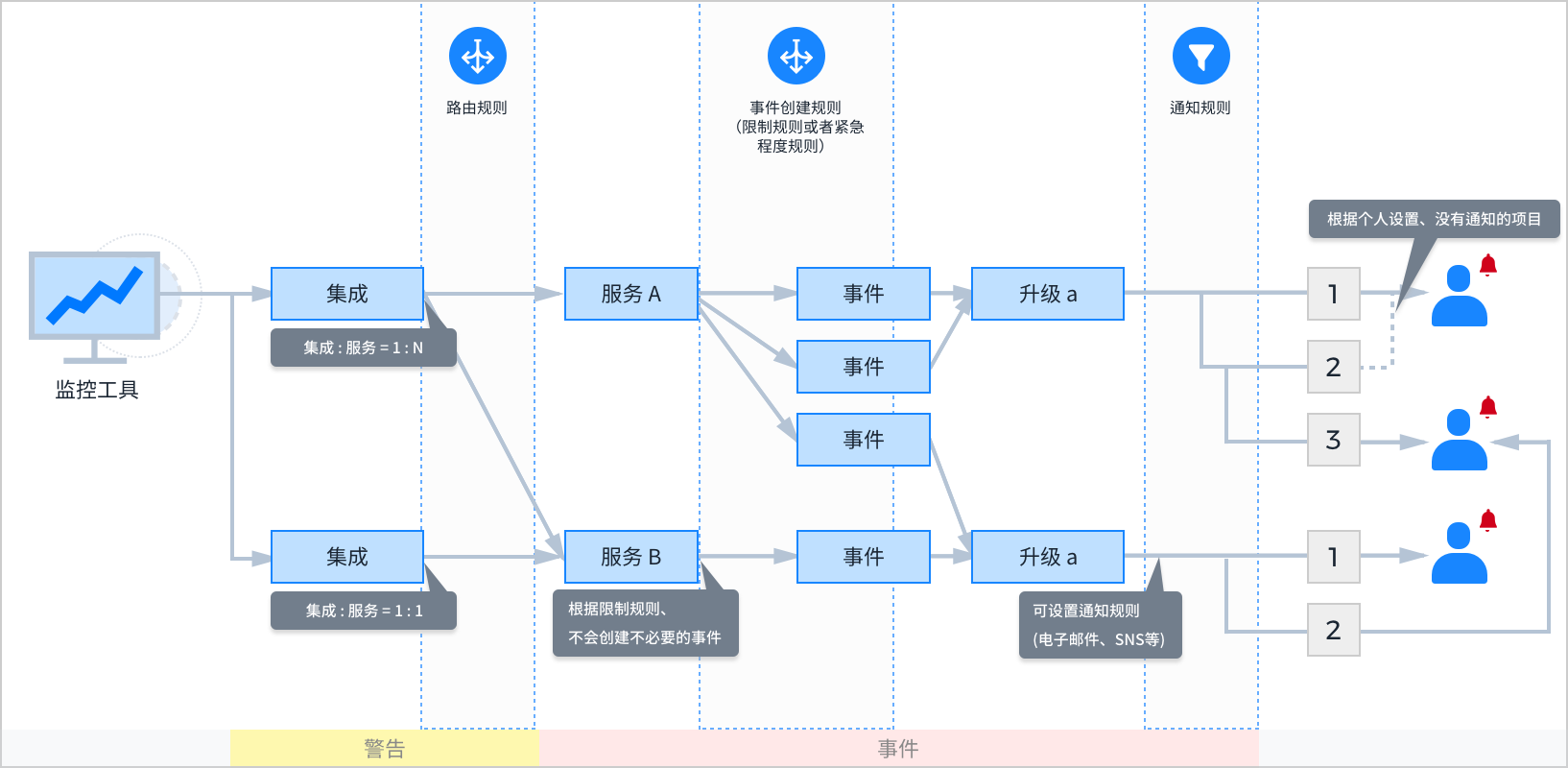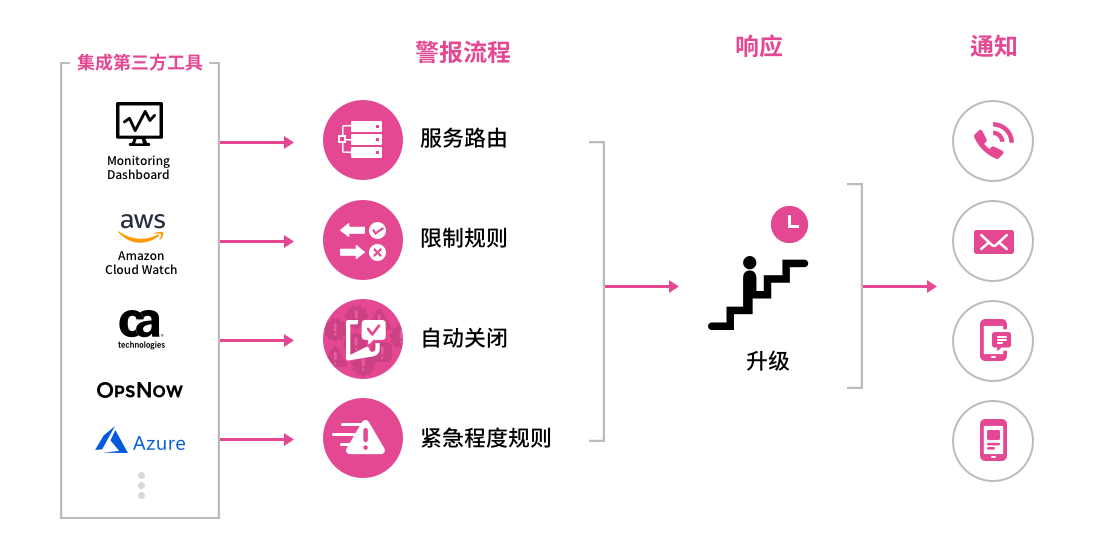 - 发生事件后,在准确的时间向最适当的负责人发送通知。