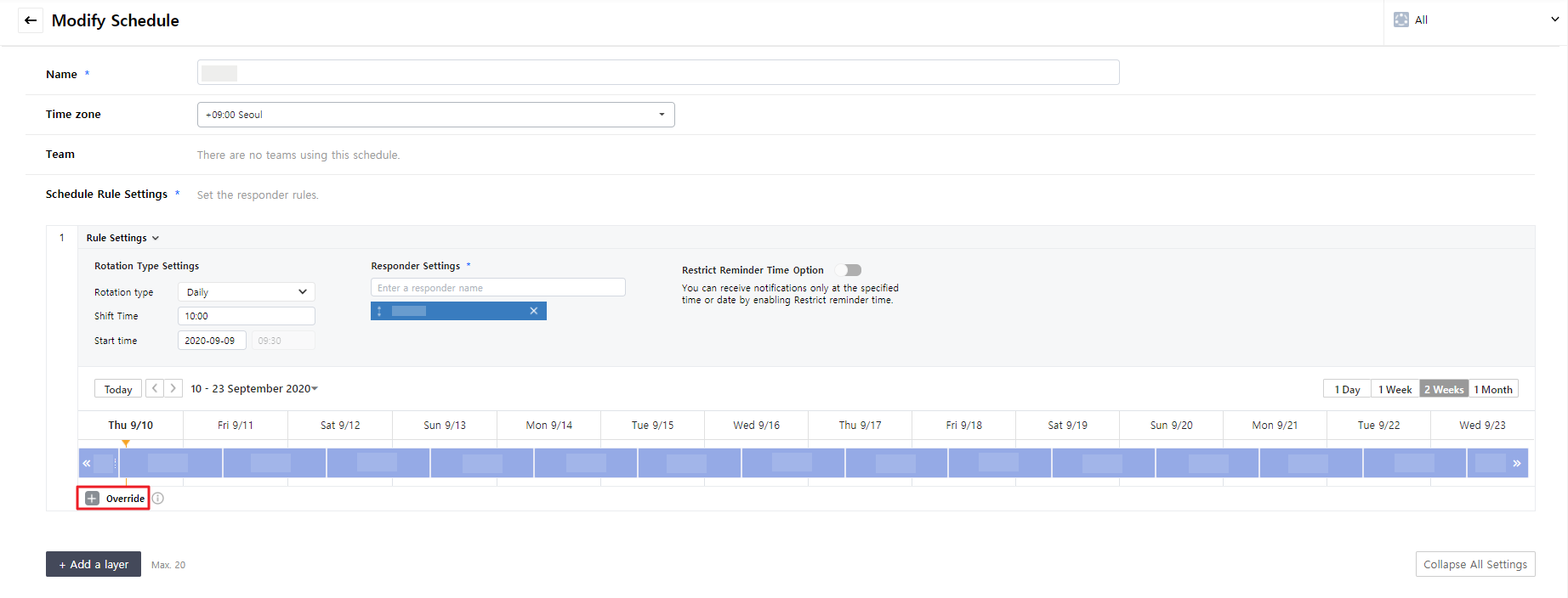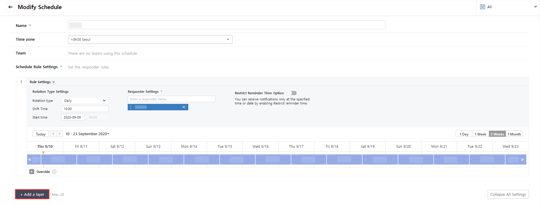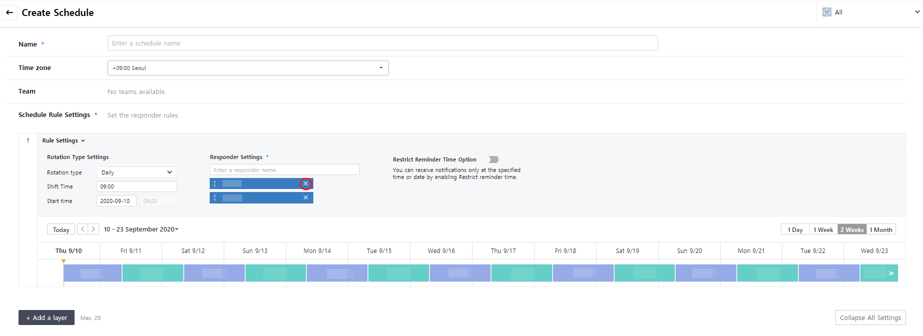 然后在响应者中输入处理升级的响应者。选择响应者时,可以选择时间表、用户、所有团队成员、随机选定的团队成员,并可以选择多个响应者。