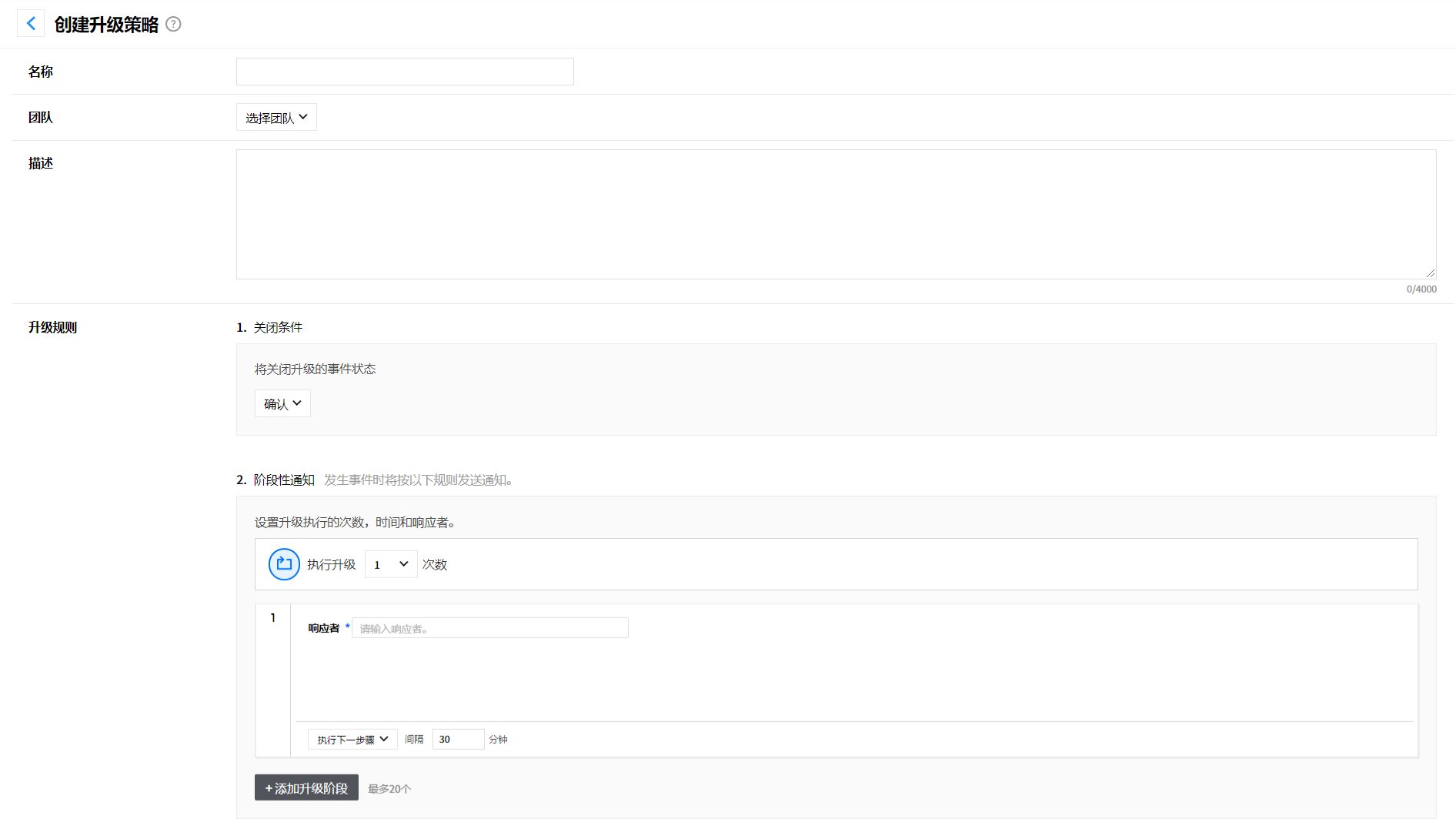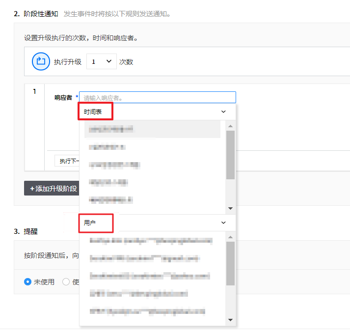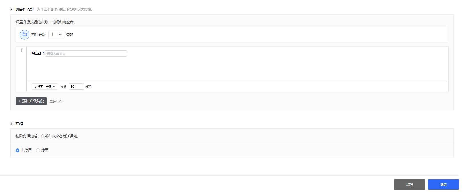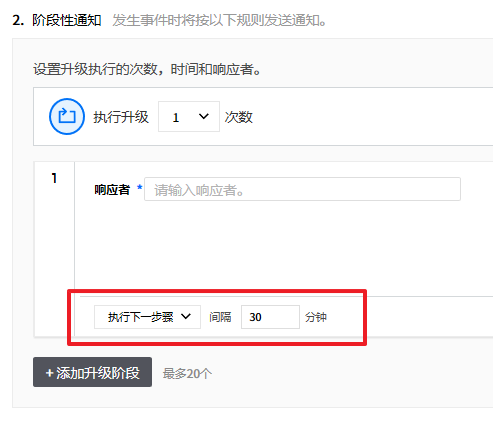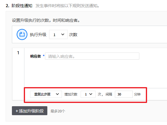 您可以点击[添加升级阶段]按钮来添加升级阶段,最多可添加20个升级阶段,可反复执行每个升级阶段。当您勾选[包含之前所有步骤的响应者]时,在发送通知时会包含之前所有步骤的响应者一起发送,被指定为各阶段响应者的用户都将收到通知。
