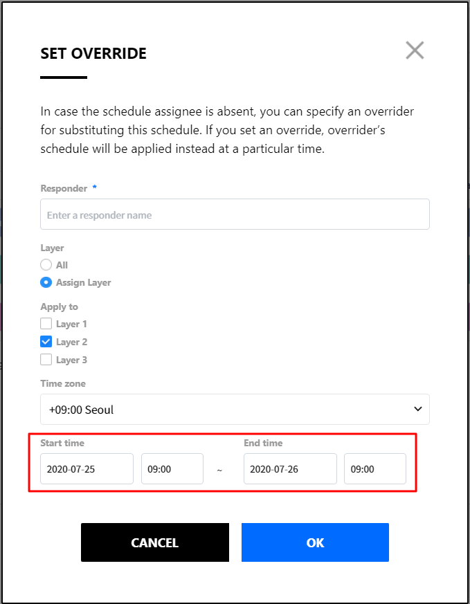 ② 选择接收通知的响应人,然后设置开始和结束时间。