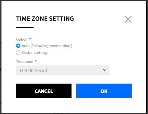 图标设置时区。时区设置弹窗如下。选择自定义设置按钮可更改时区。设置完成后点击[确定]按钮。