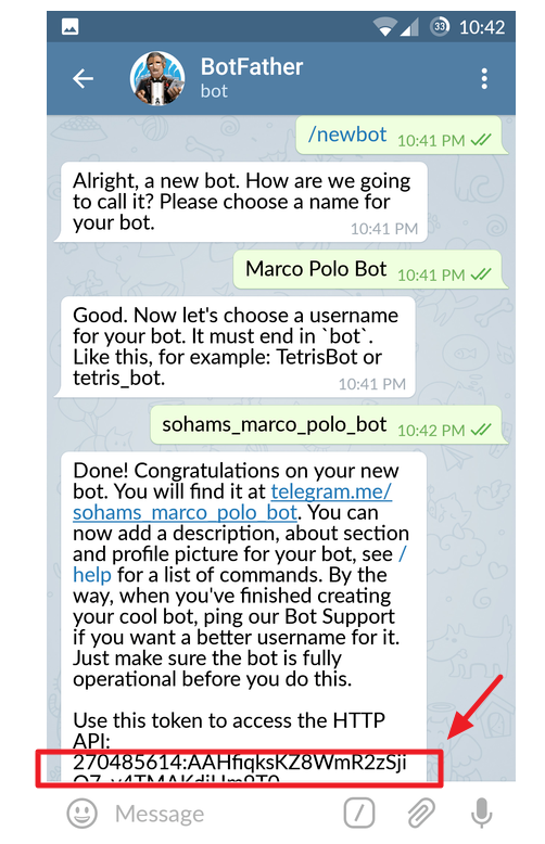 ④ To create a bot token, enter Marco Polo Bot for the new bot and sohas_marco_polo_bot for the username. This is a sample to show you how to create the token.
