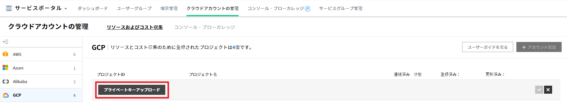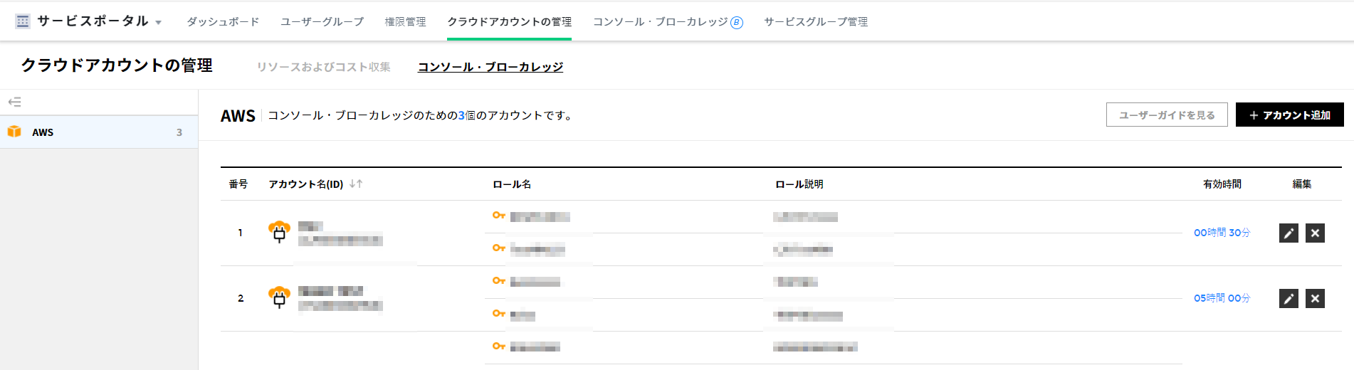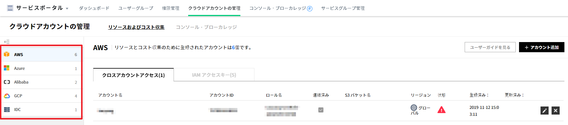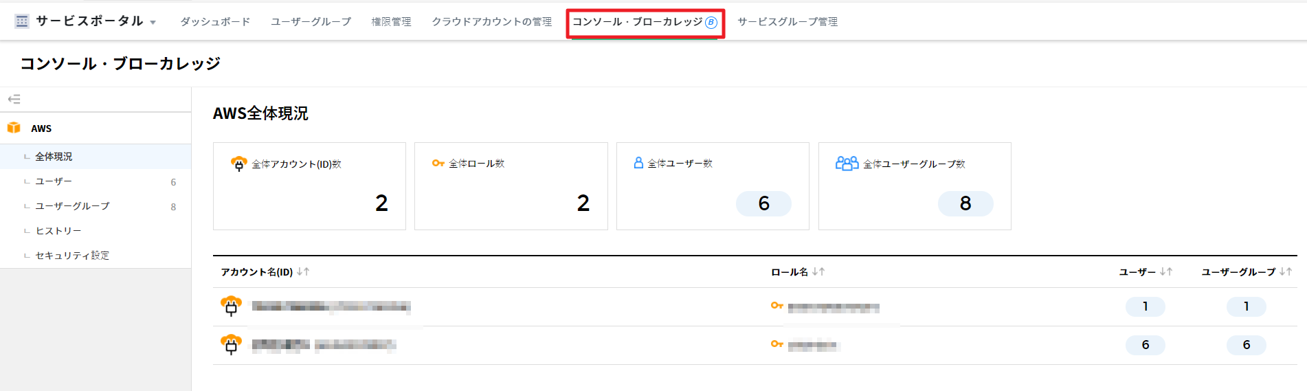 使用中のサービスのまとめ情報とメンバーの権限、クラウドアカウント、サービスグループ、コンソール・ブローカレッジなどを管理できます。