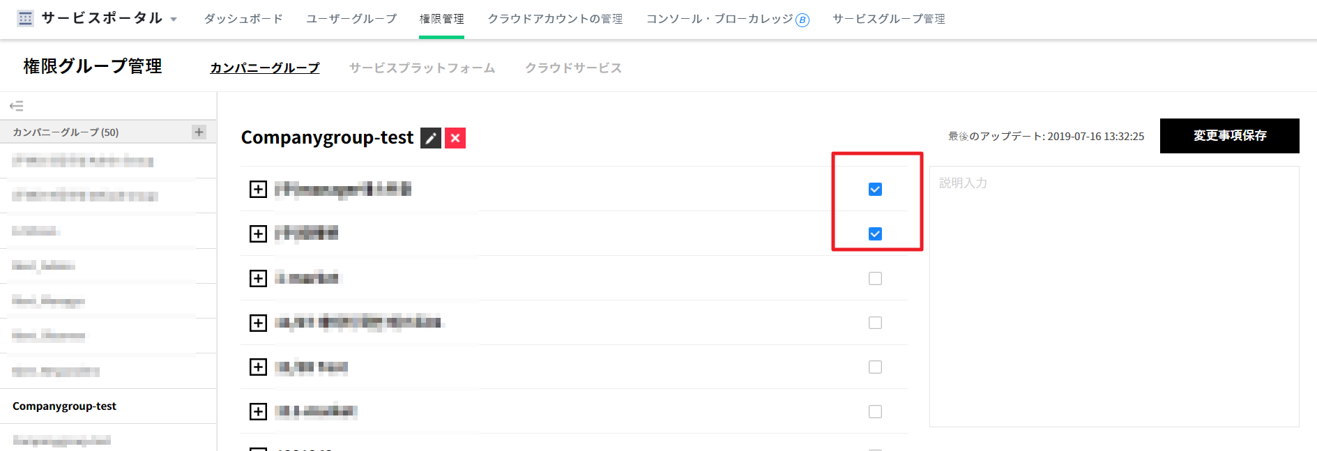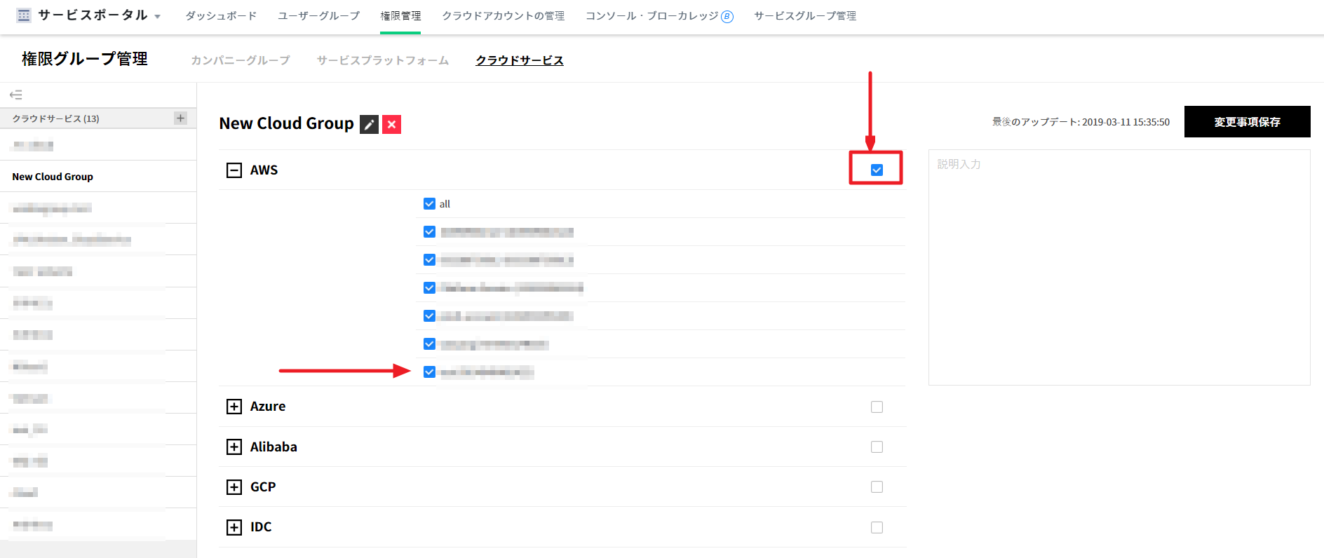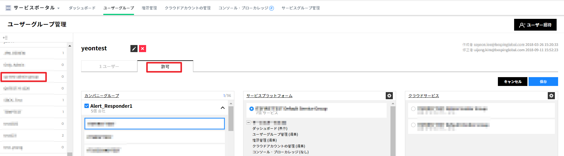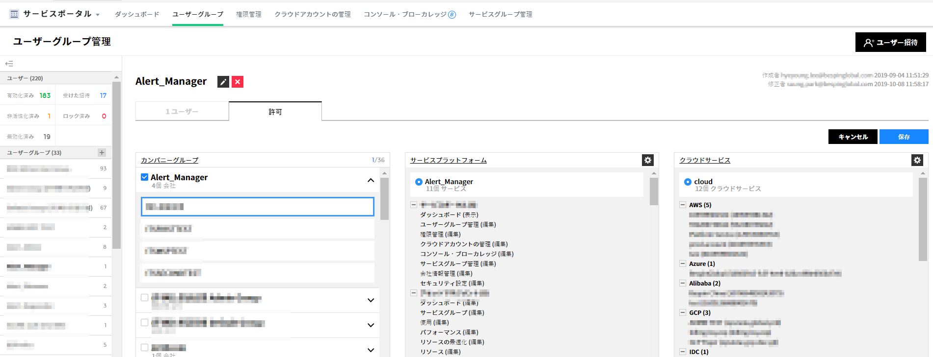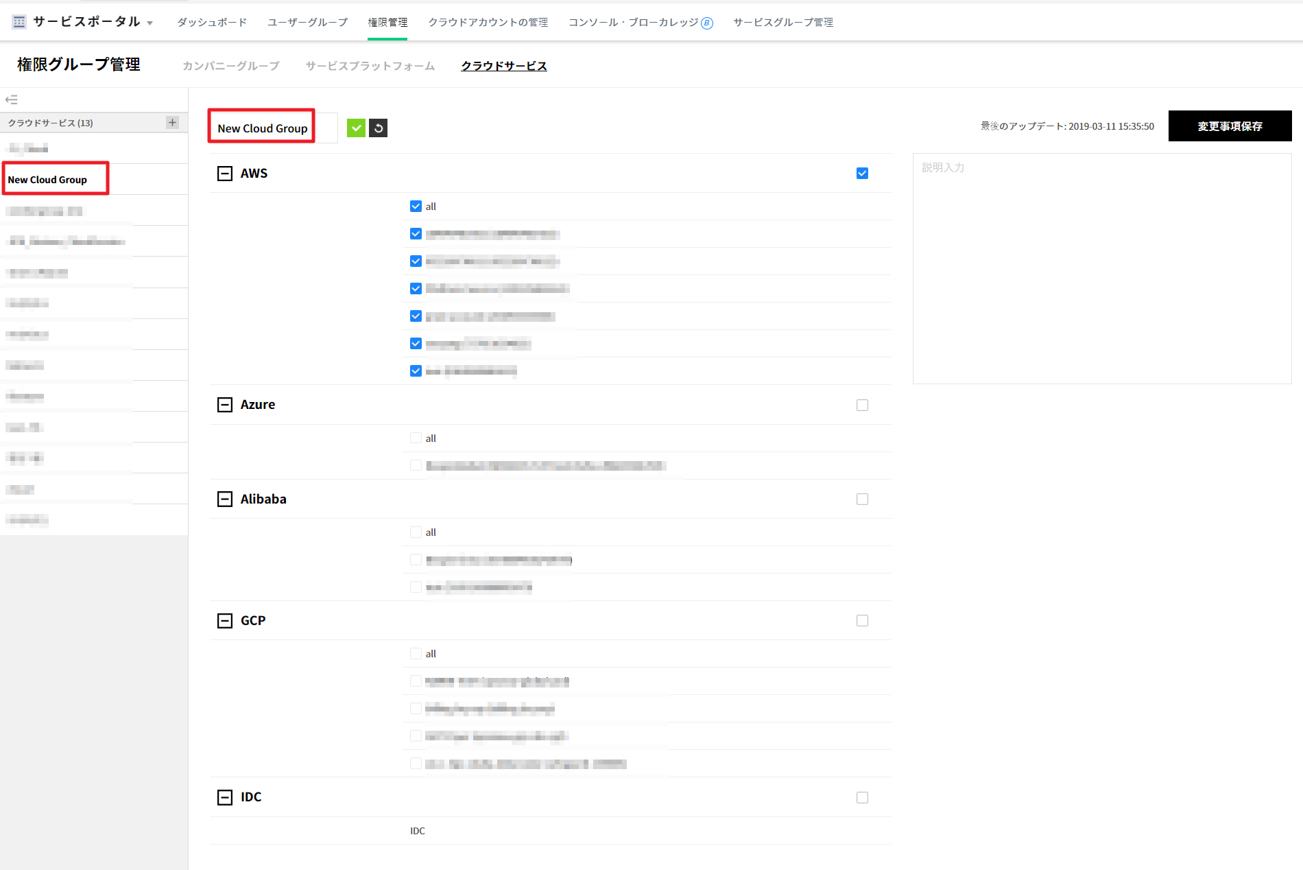 選択したユーザーグループに付与する会社別のサービスプラットフォームとクラウド権限を設定できます。![]()