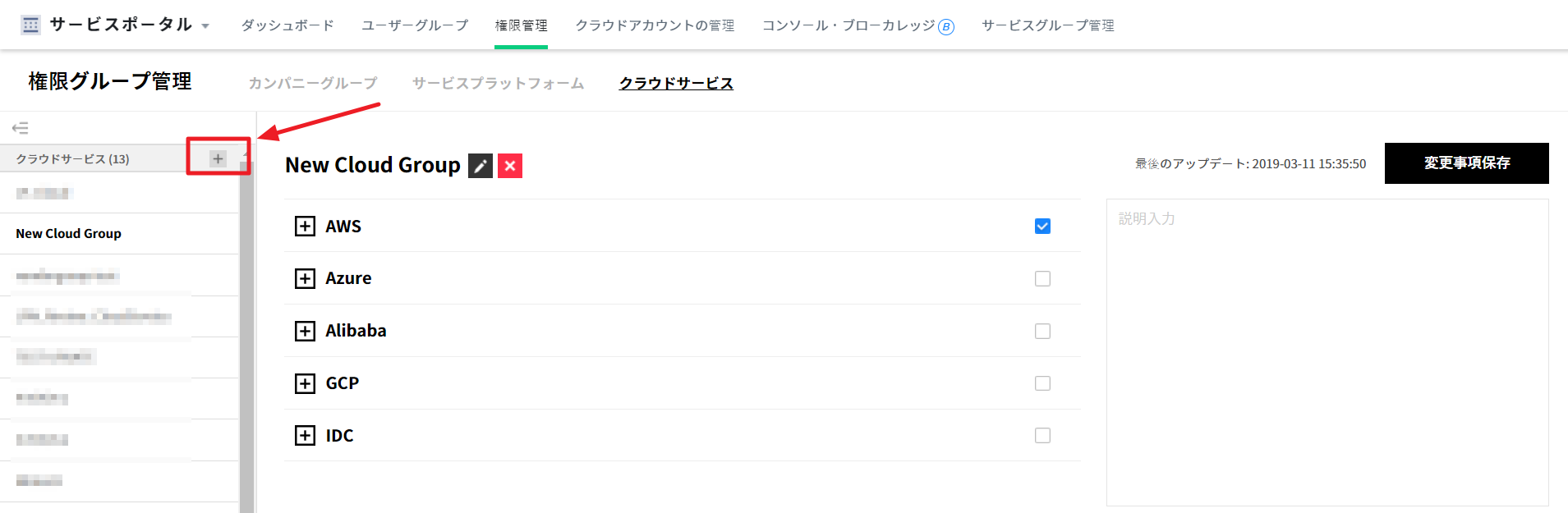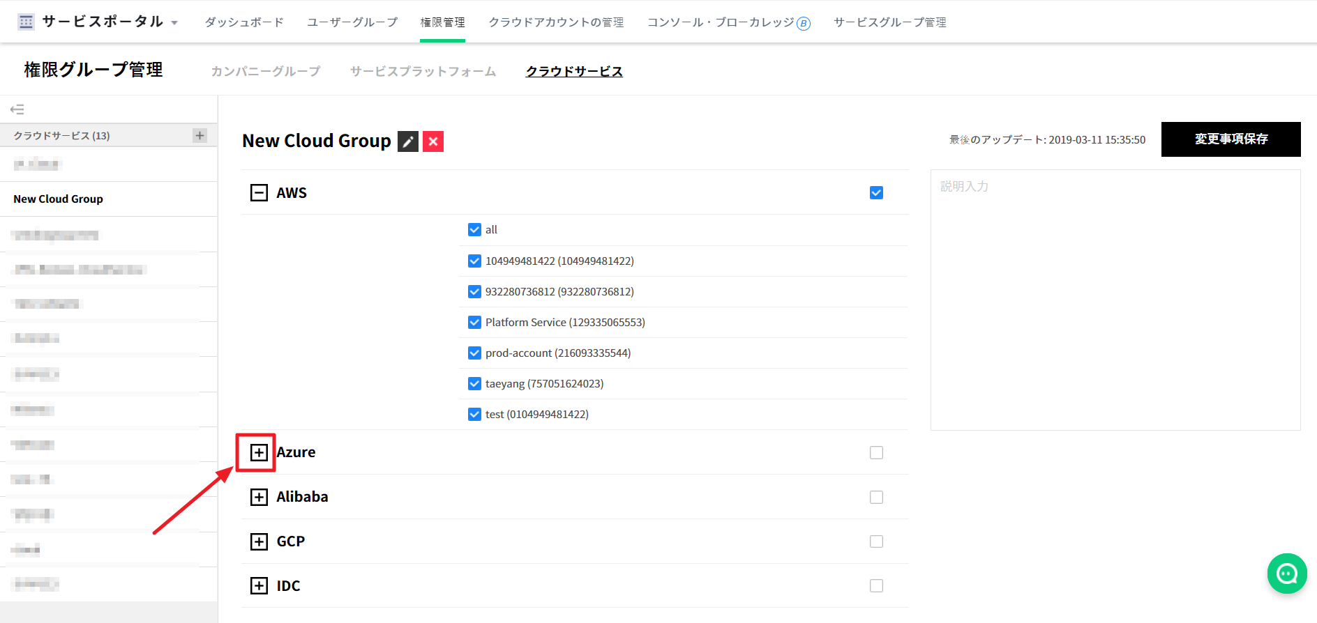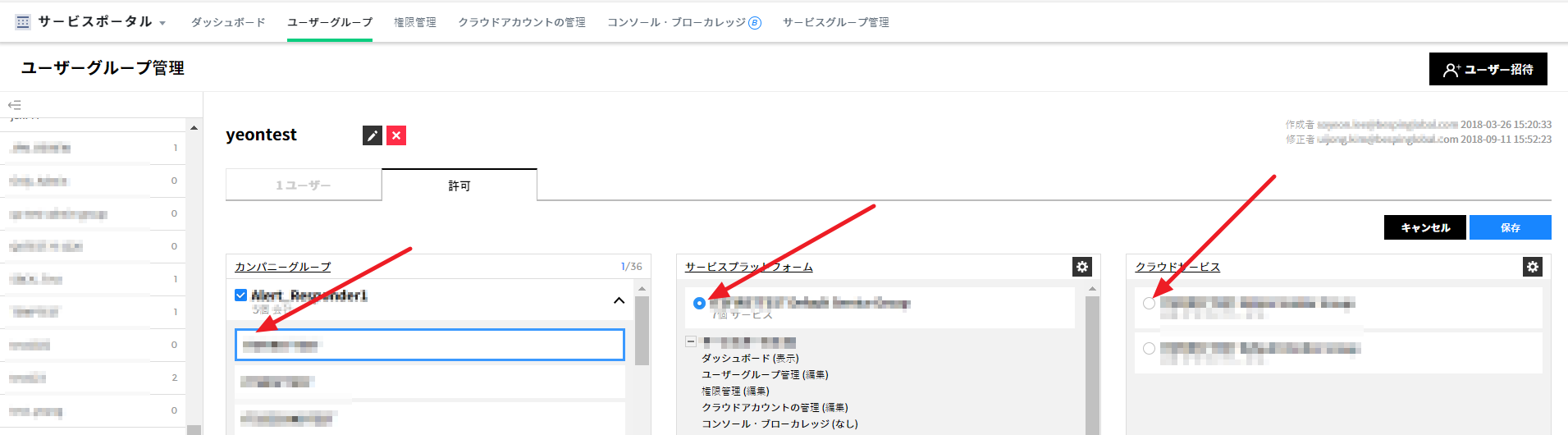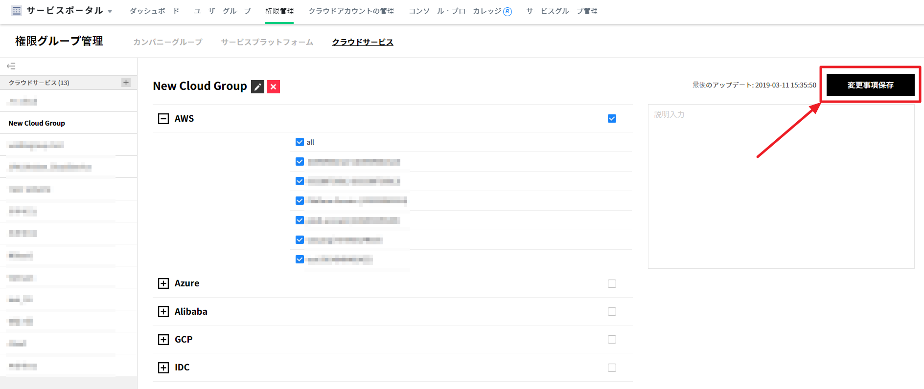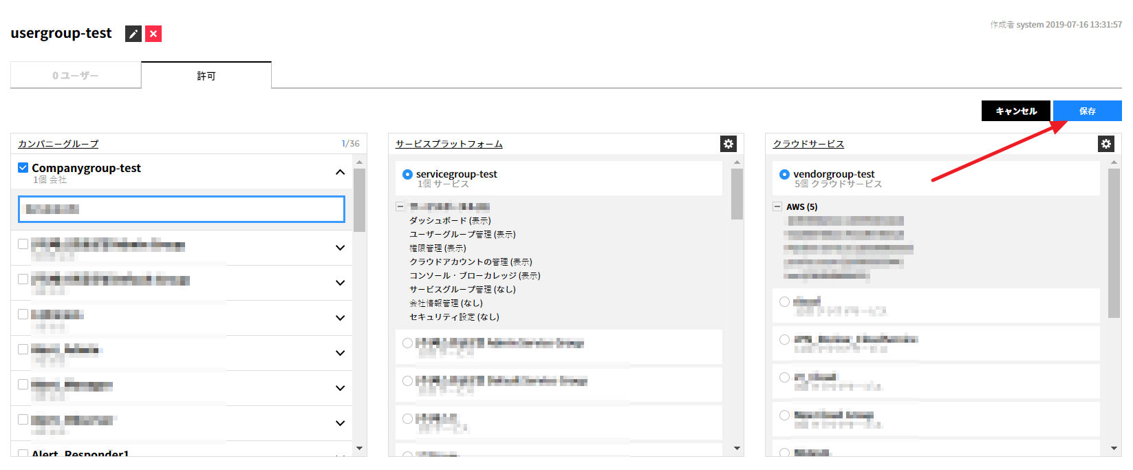 選択したユーザーグループに付与する会社別のサービスプラットフォームとクラウド権限を設定できます。![]()