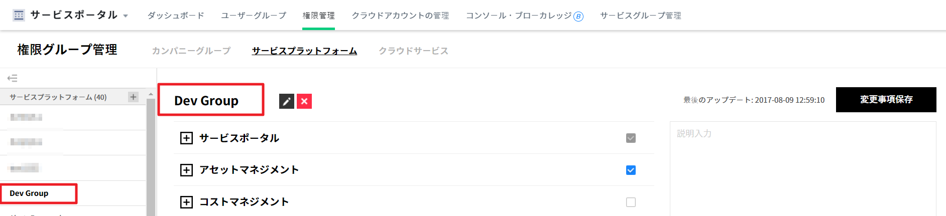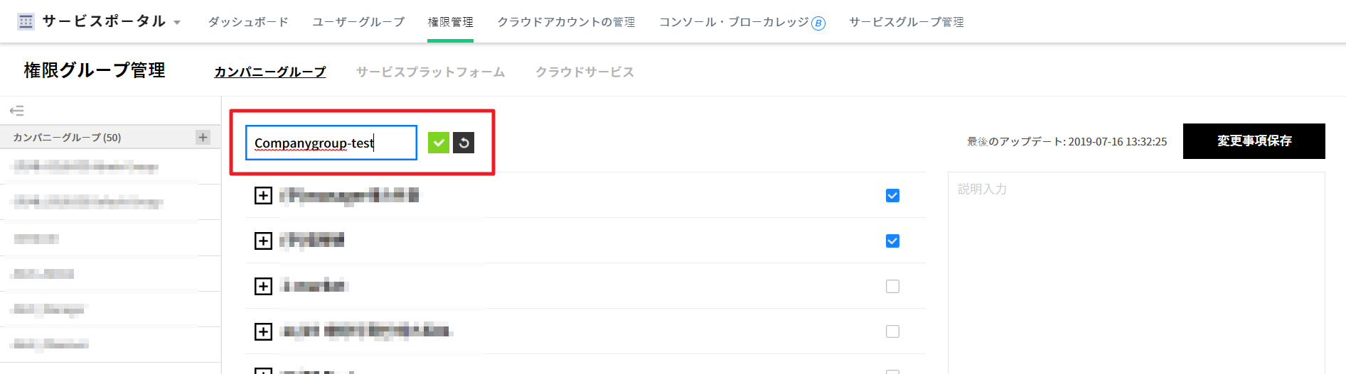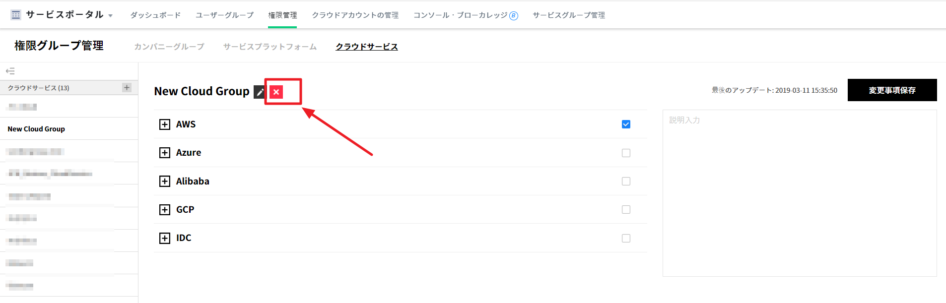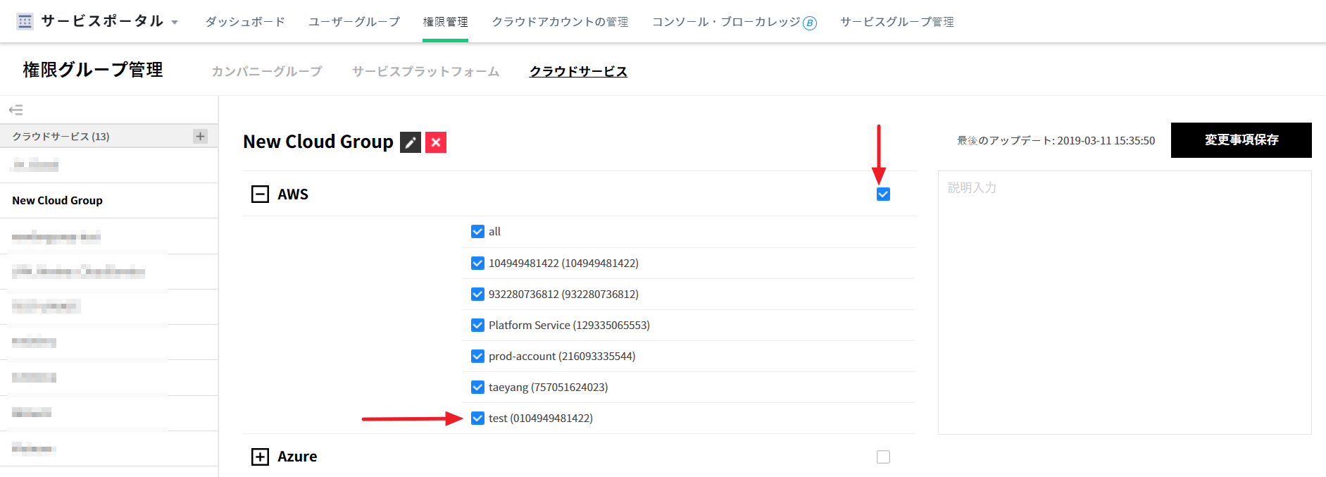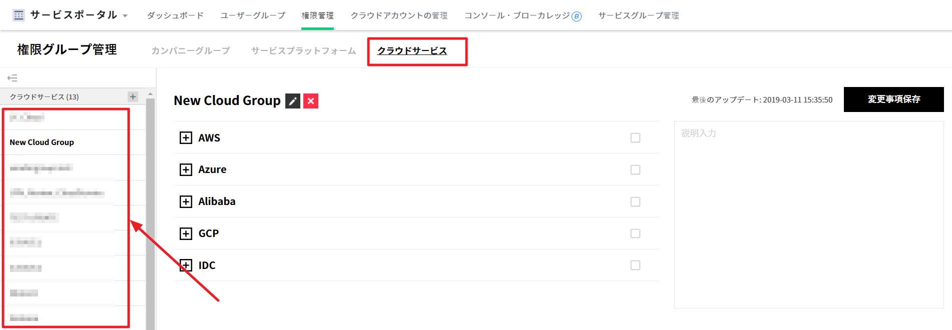 選択したユーザーグループに付与する会社別のサービスプラットフォームとクラウド権限を設定できます。![]()