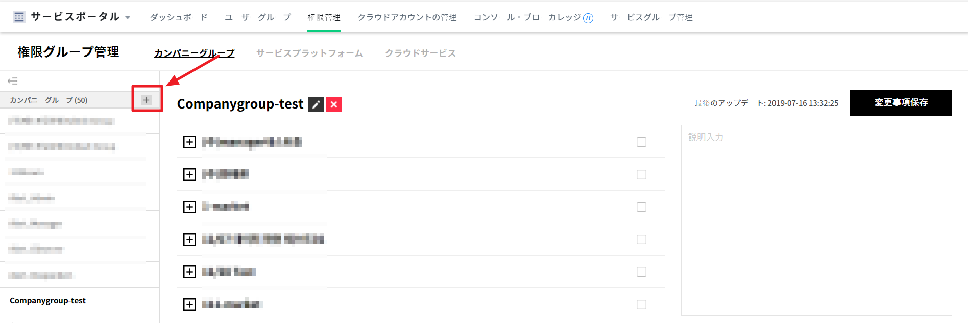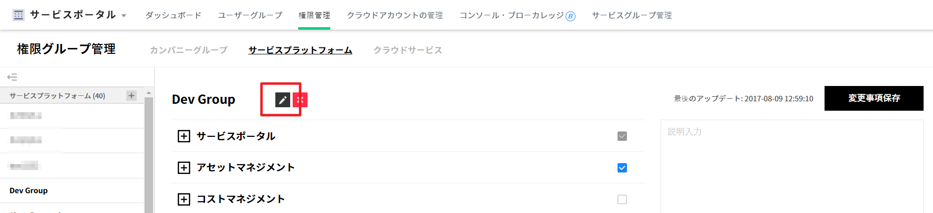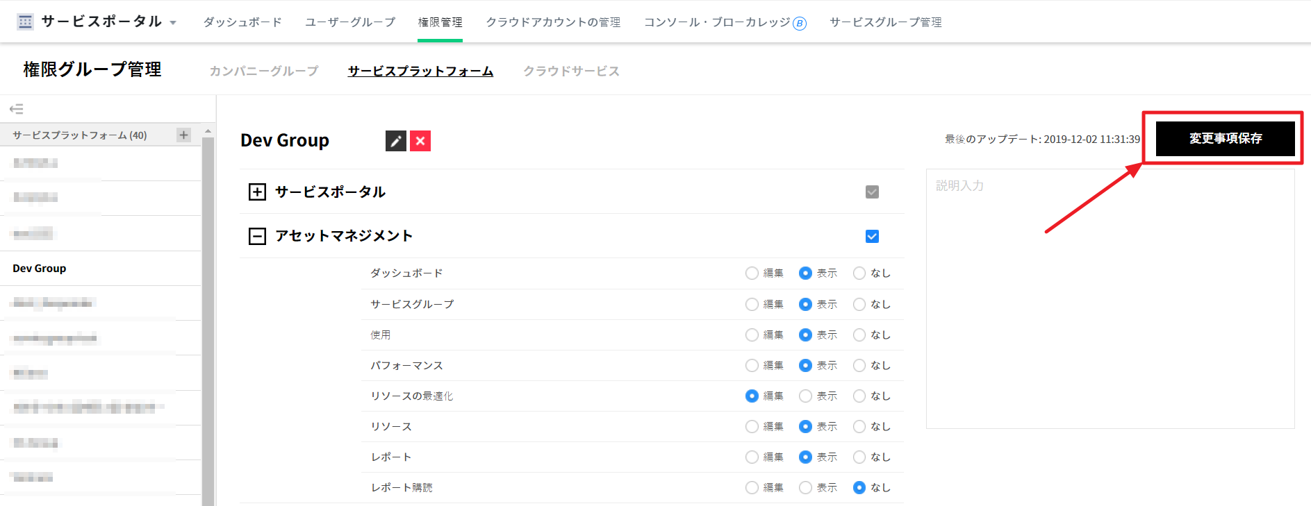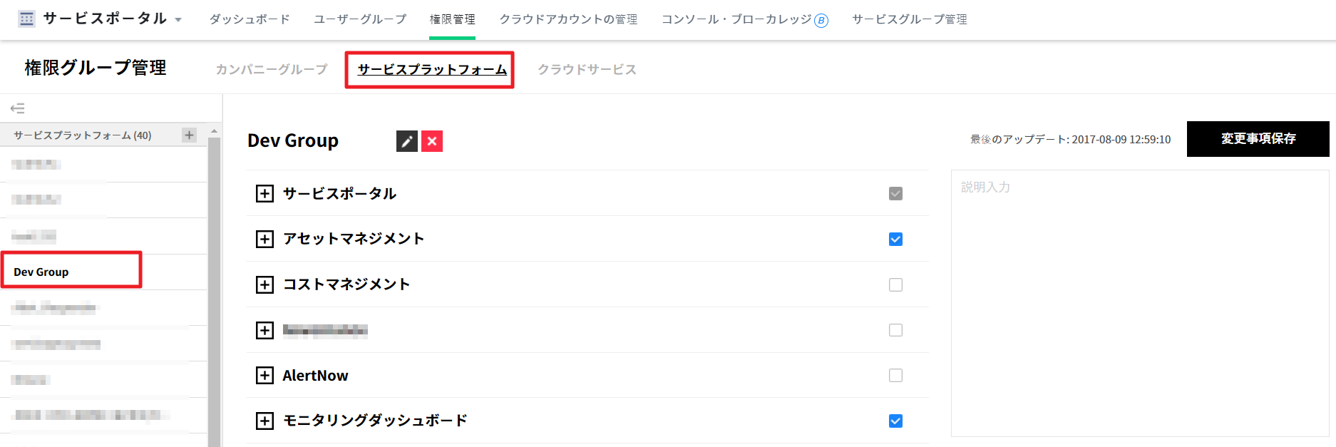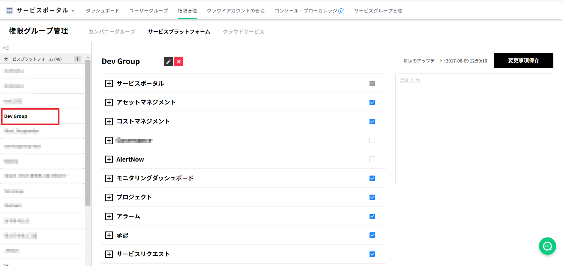 選択したユーザーグループに付与する会社別のサービスプラットフォームとクラウド権限を設定できます。![]()