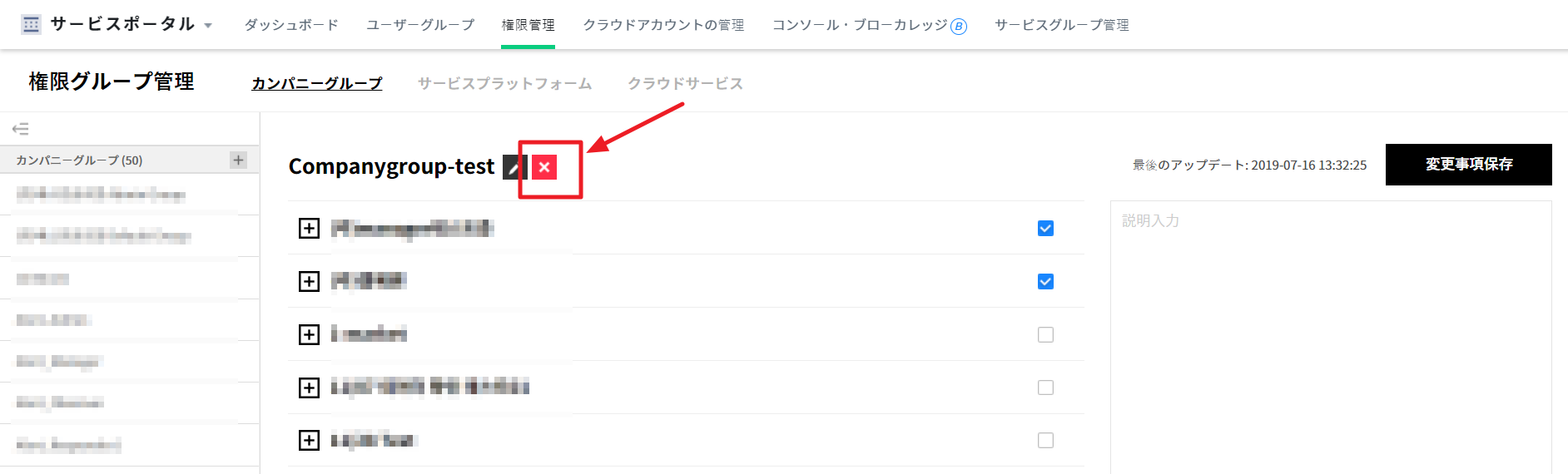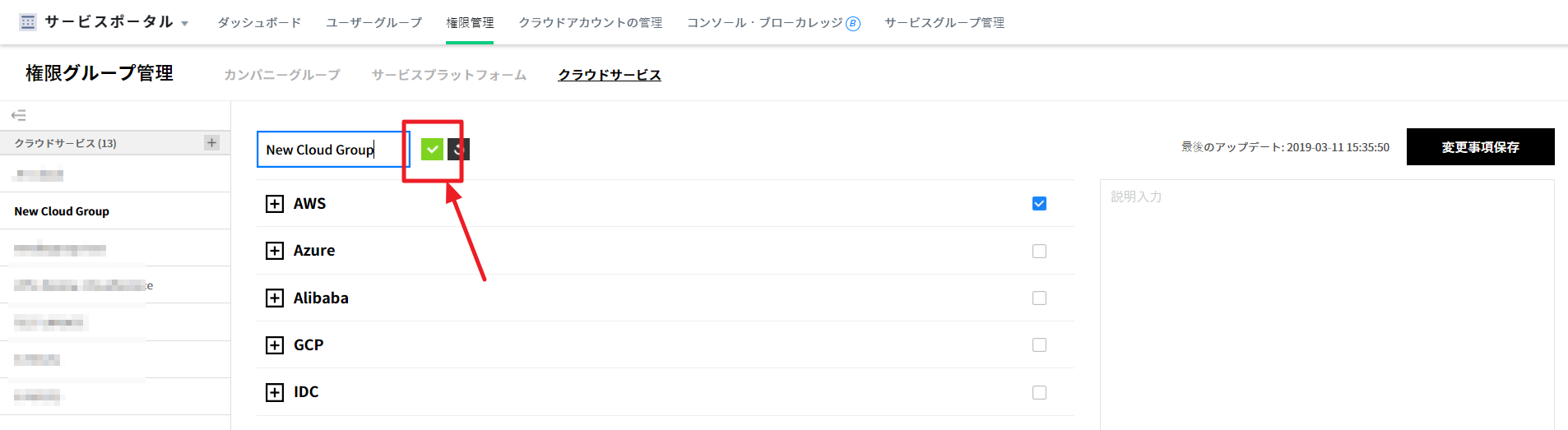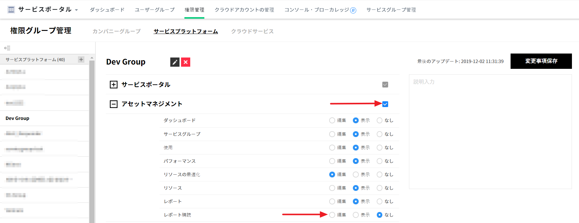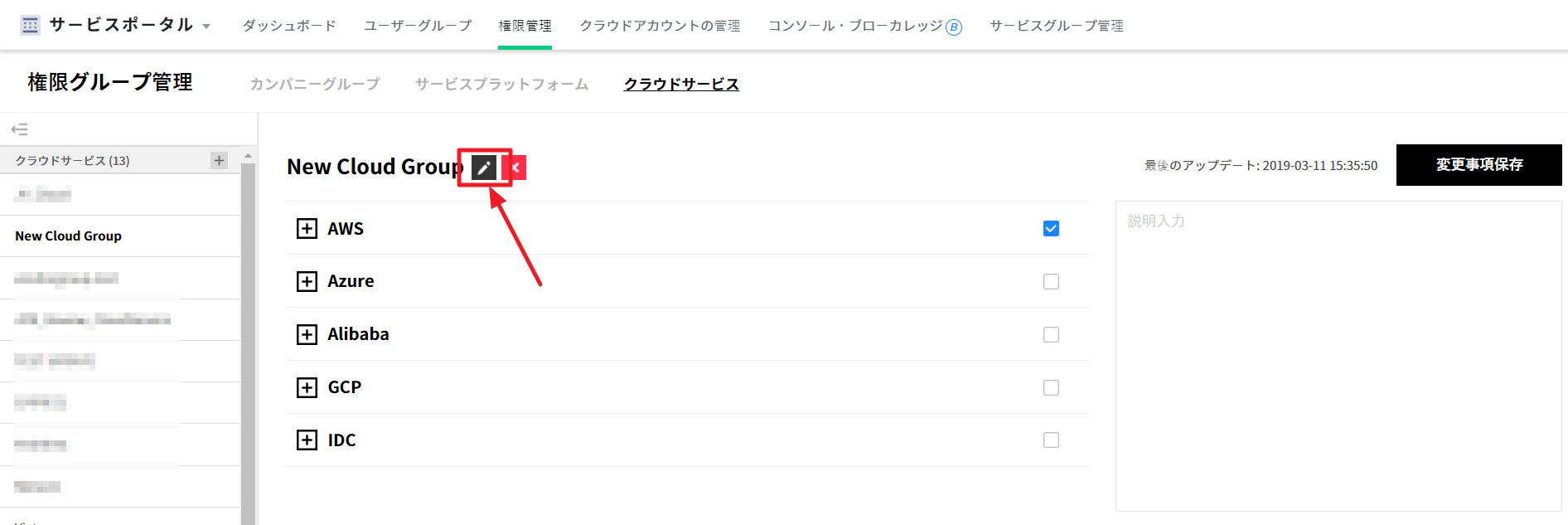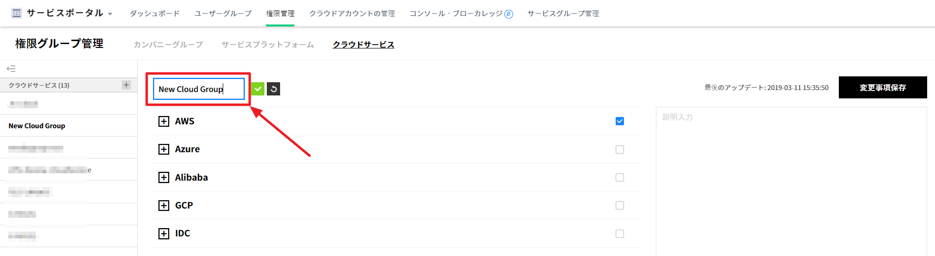 選択したユーザーグループに付与する会社別のサービスプラットフォームとクラウド権限を設定できます。![]()