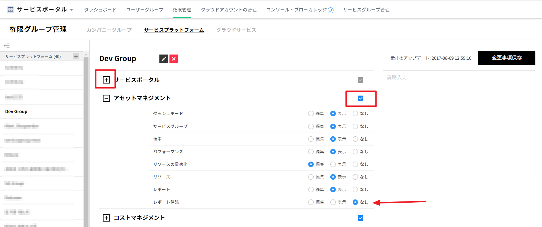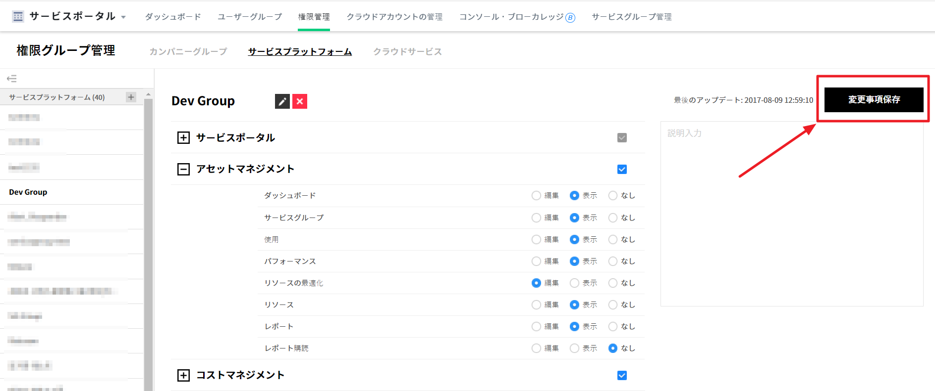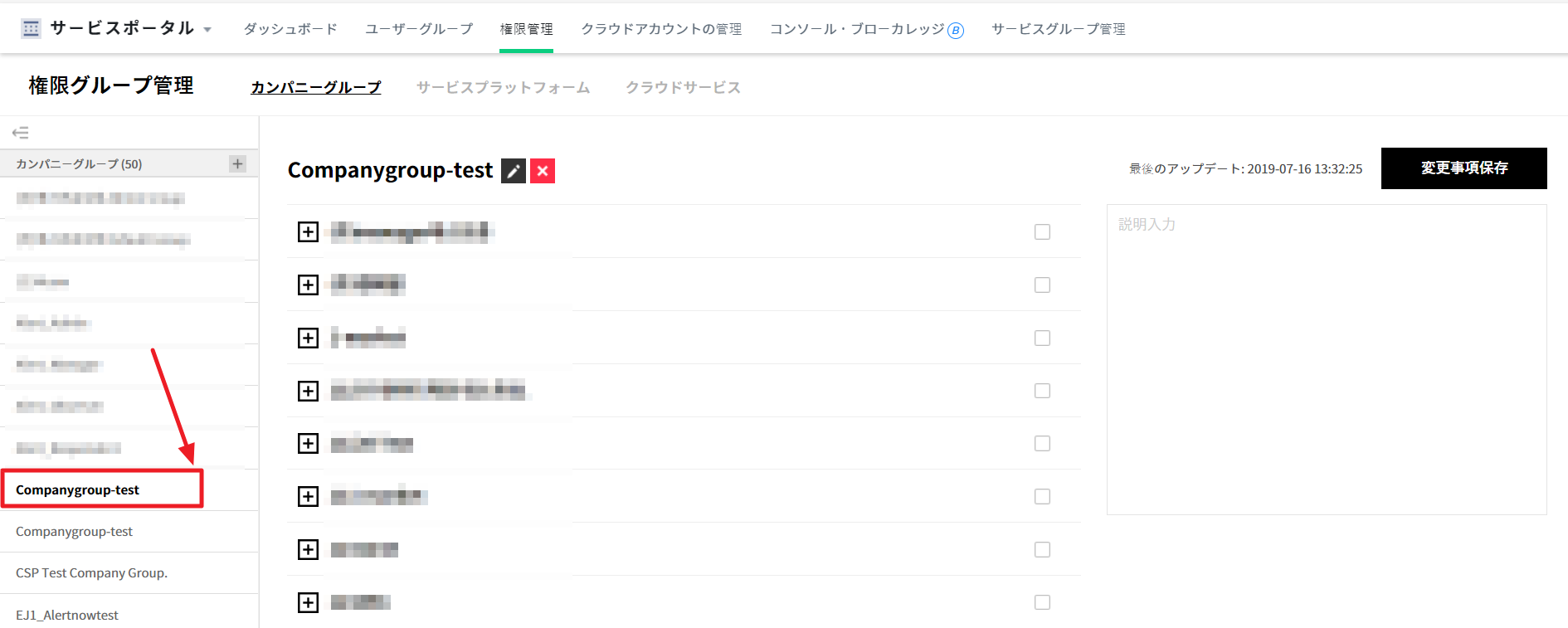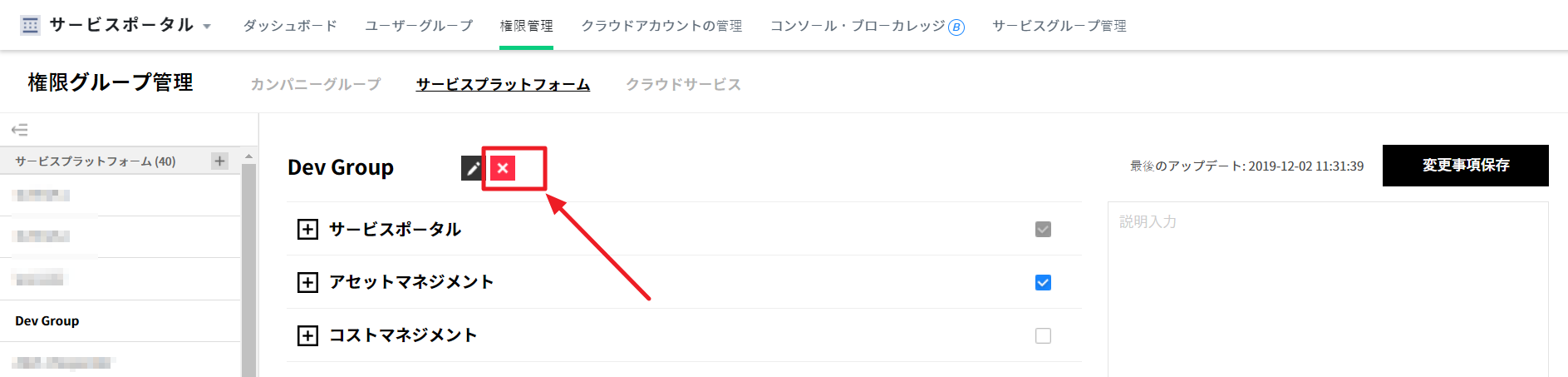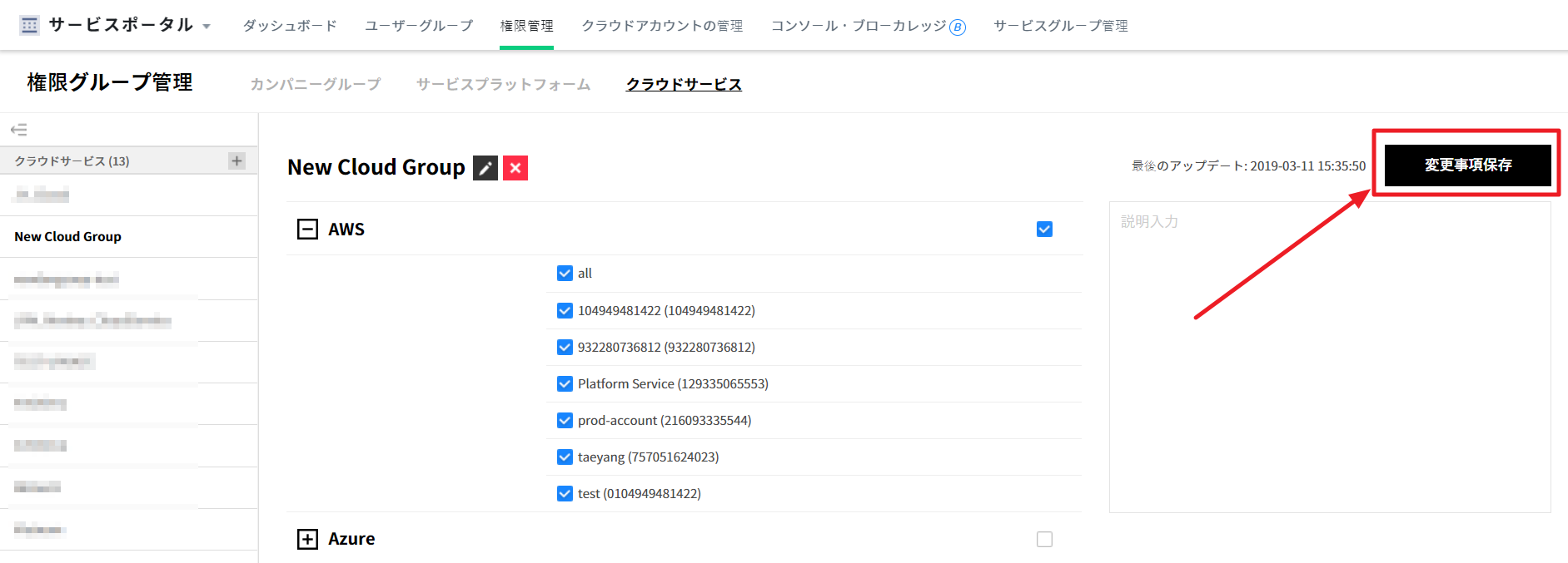 選択したユーザーグループに付与する会社別のサービスプラットフォームとクラウド権限を設定できます。![]()