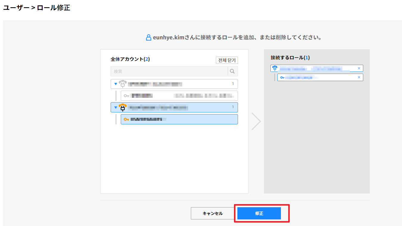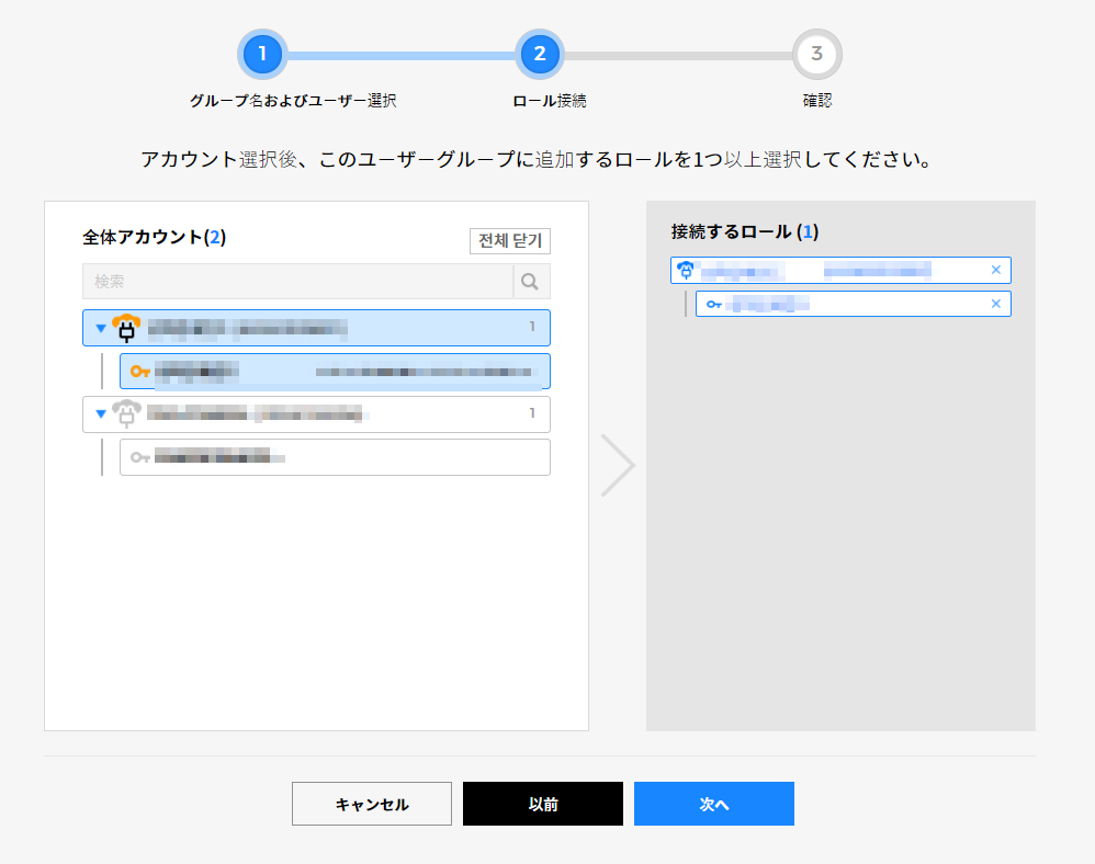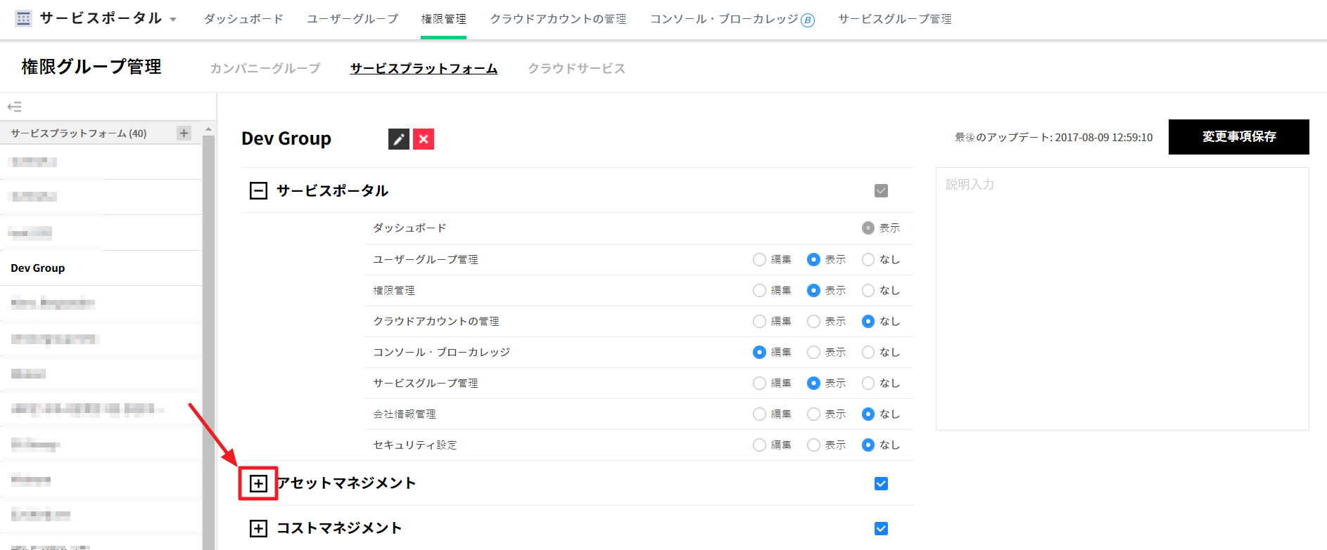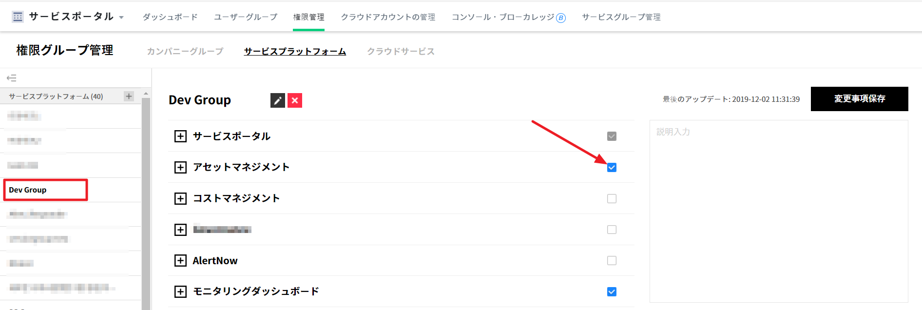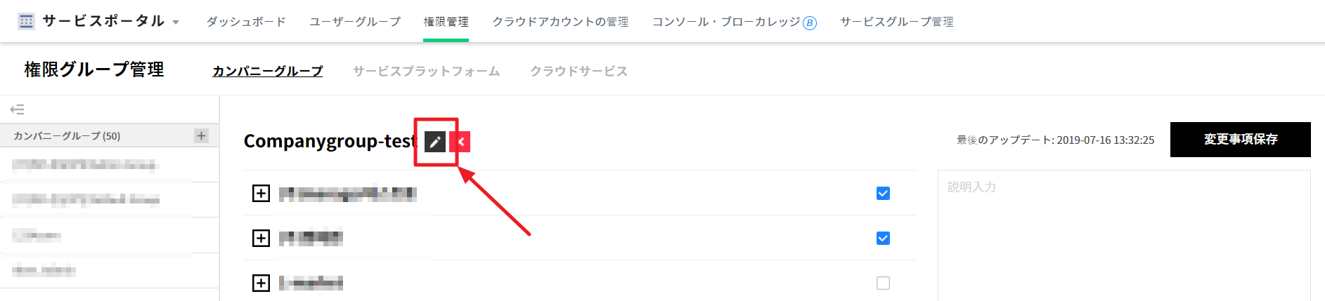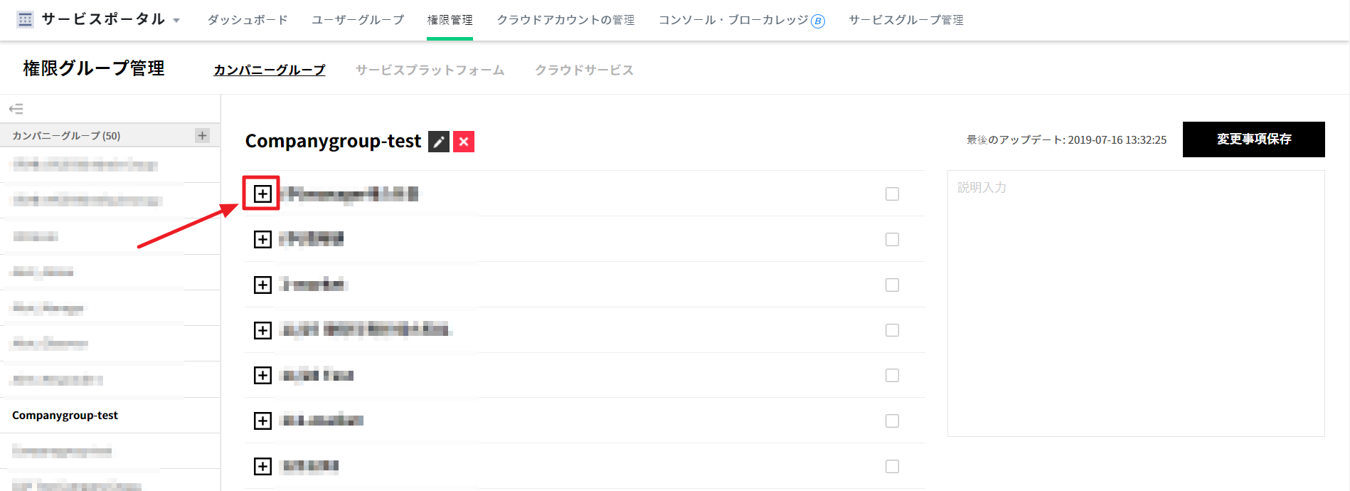 選択したユーザーグループに付与する会社別のサービスプラットフォームとクラウド権限を設定できます。![]()