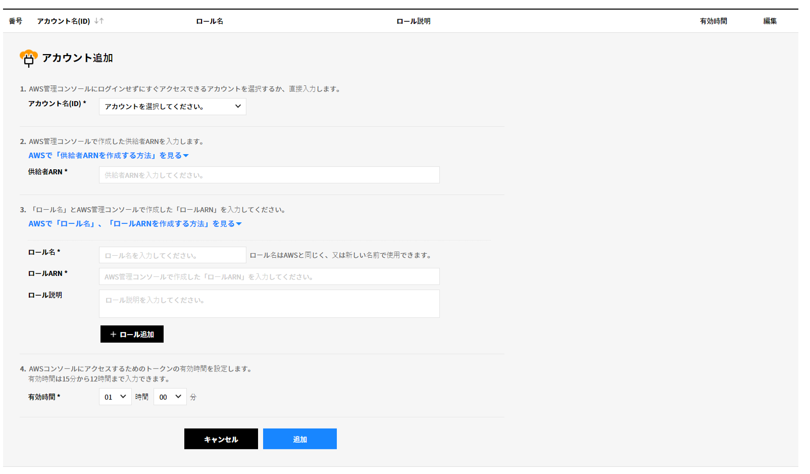 [新規ルール追加]ボタンを選択すると、リストが拡張され設定オプションが表示されます。既に設定された条件がある場合は共に表示され、アカウントの条件が選択されていない、または重複した条件が他のサービスグループに設定されている場合、アラートメッセージが出力され保存されません。