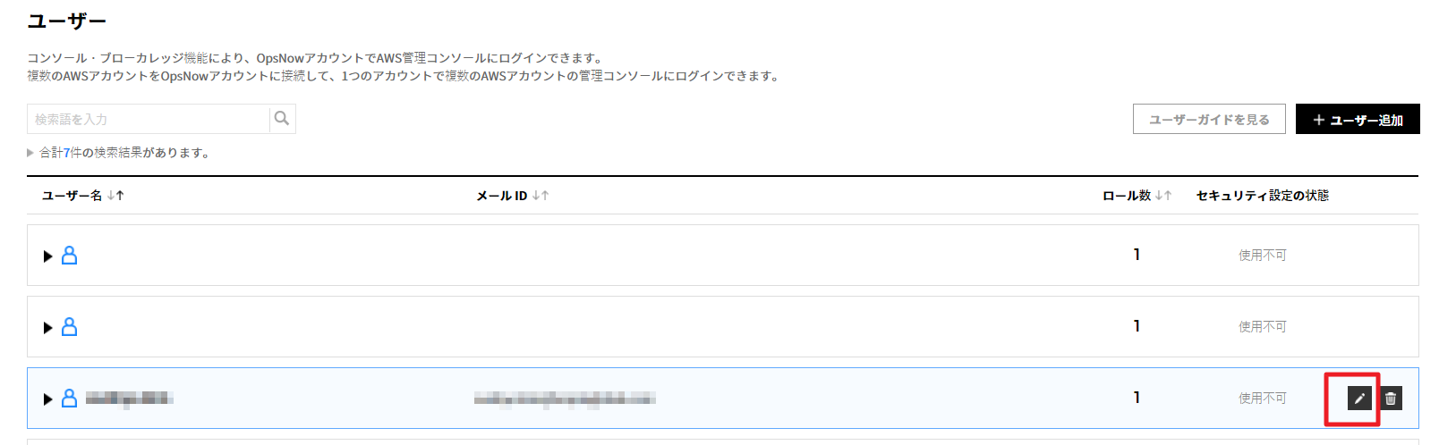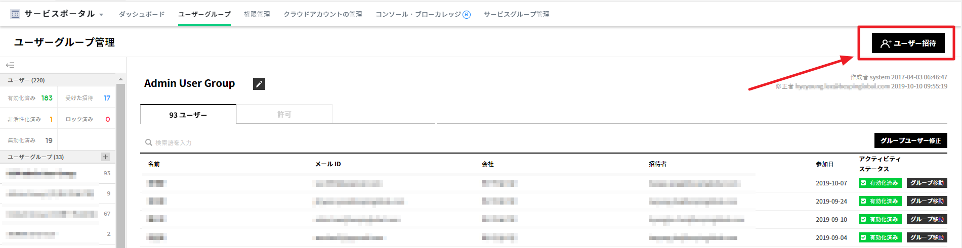 - 参考:ユーザーグループリストでユーザーのステータス確認及び変更もできます。リストの右側の[有効化済み]ボタンをクリックしてユーザーのステータスを有効化、無効化、使用中止などに変更できます。また、左上で全体のユーザーのステータスを[有効化済み]、[無効化済み]、[非活性化済み]、[招待済み]、[ロック済み]などで確認できます。