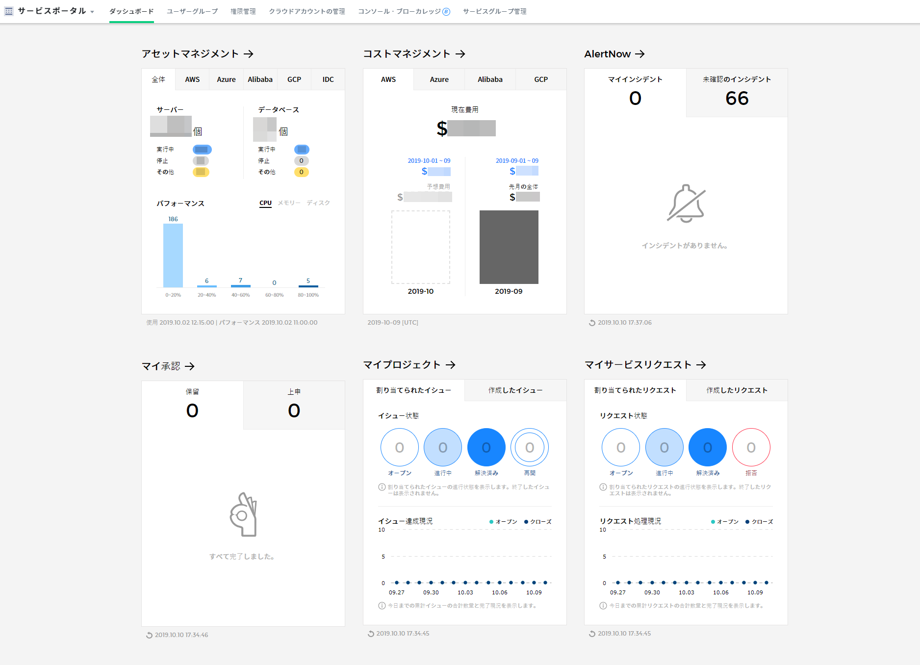 現在使用中のクラウドサービスとインフラリソースの使用量及び性能などの情報を実際のアセットマネジメント画面に移動しなくてもダッシュボードですぐ確認できます。