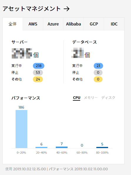 上段の全体タブをクリックすると、運用中のすべてのマルチクラウド、ハイブリッド環境のサーバ、データベース使用数量と性能による数量分布を確認できます。 - クラウドサービス別の情報