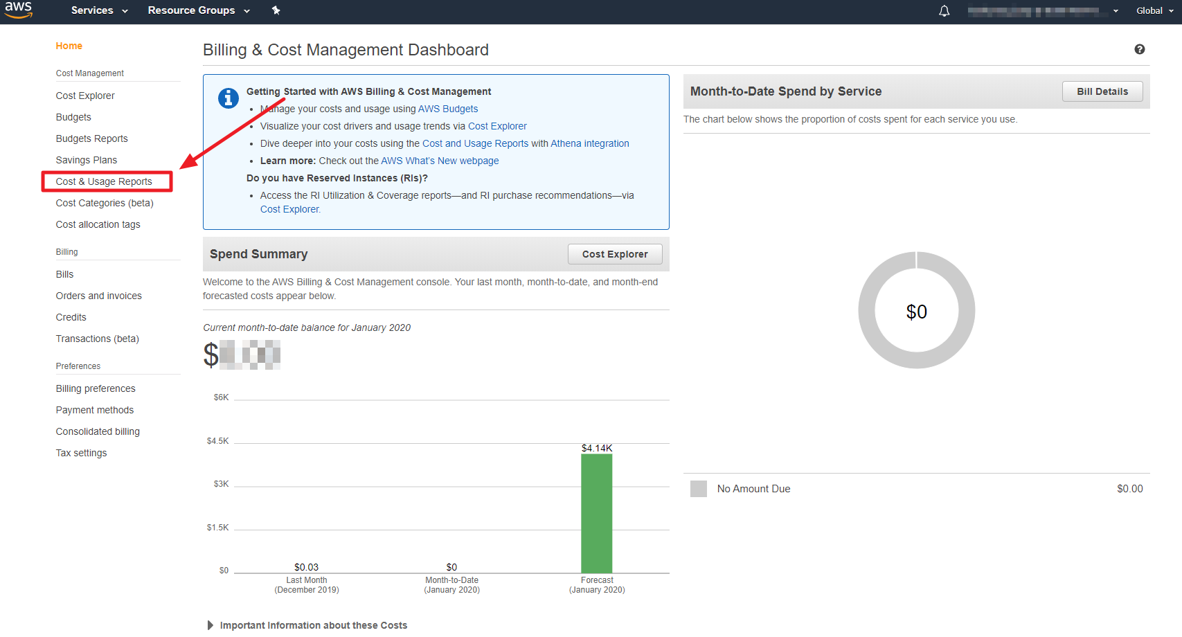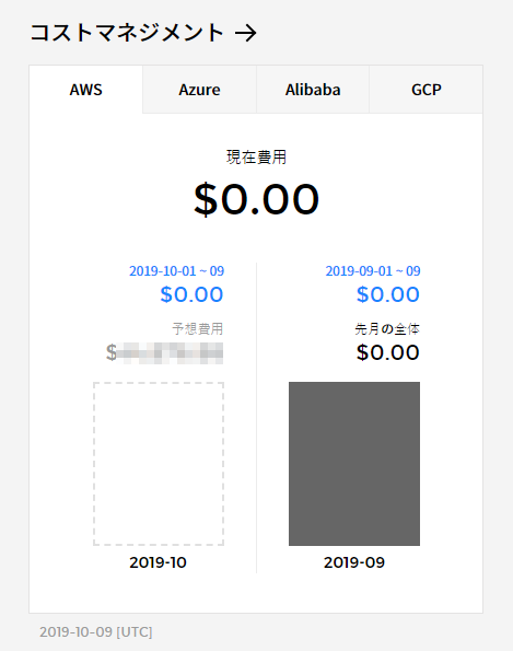 今月に発生したコストと今月の全体予想コストがボックス内の左側に棒グラフで表示され、先月の予想コストと発生コストは右側で確認できます。