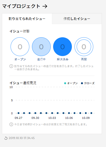 ユーザーに割り当てられたイシューとイシュー状態などを数値とチャートで確認できます。 - 作成したイシュー