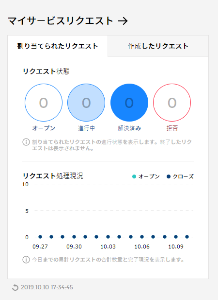 マイサービスリクエストカードビューの上段にある矢印をクリックすると、マイサービスリクエストのダッシュボード画面に移動します。 - 割り当てられたリクエスト/作成したリクエスト