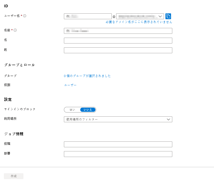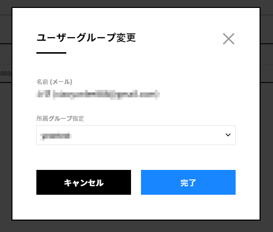 変更するユーザーの名前とメールを入力して移動するグループを指定してから[完了]ボタンをクリックします。