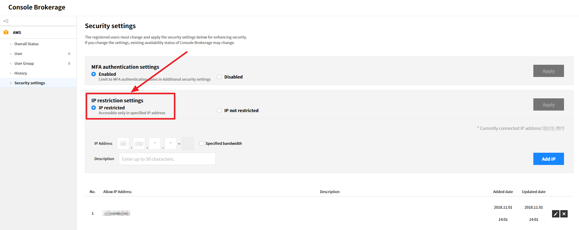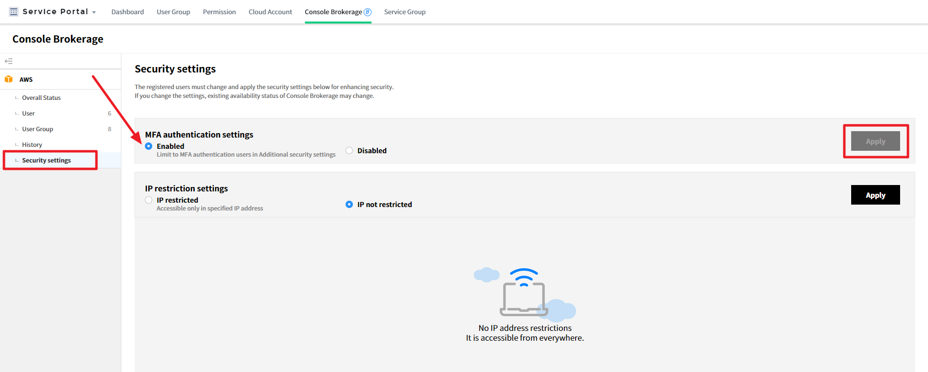 After registering IP address, you can access the Admin portal service with the registered IP address only. If you have to use different IP address to access the service, you need to go through IP address registration process again.