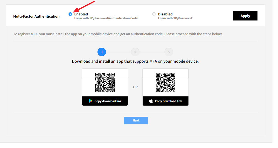 2.1. Enable Multi Factor Authentication feature and click Apply button. For Admin users, it is mandatory to use MFA but for non-admin users, it is optional.