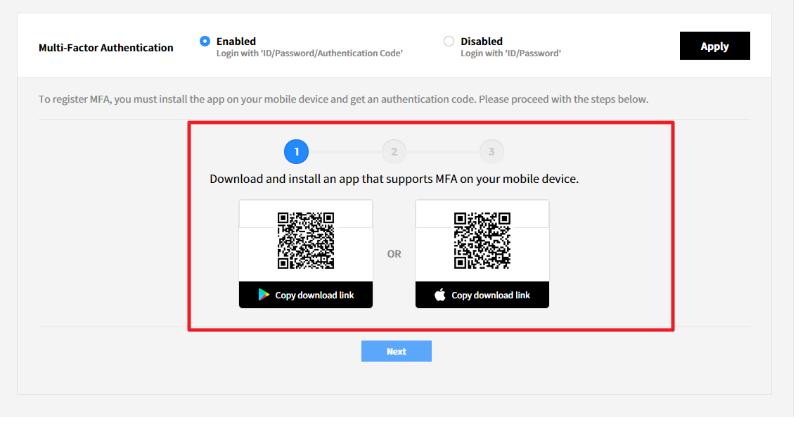 2.3. Install the application on your mobile device after enabling MFA. You can download an authentication application or scan the QR listed below with your mobile device, then it will automatically take you to available application to download.