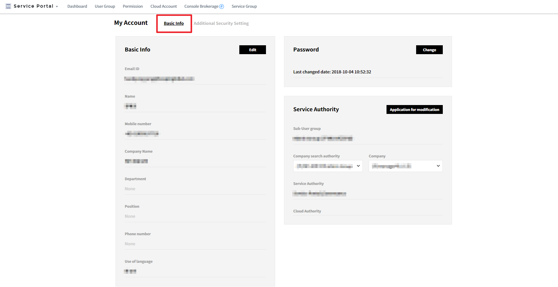 On Basic Information page, you can check basic information such as email ID, name, phone number, company name, granted service groups, service permission, and retrievable companies.