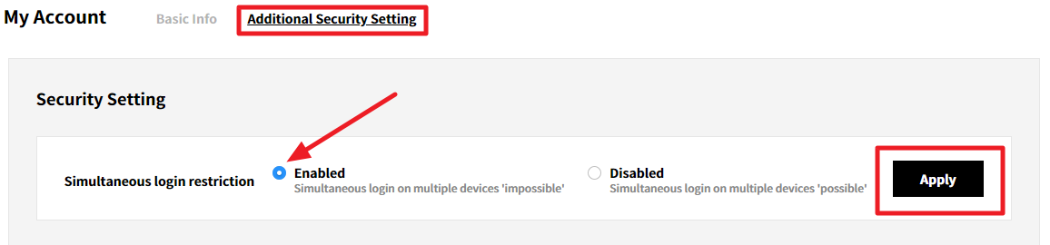 On this page, select Enabled and click Apply button to apply Restrict Multiple Logins.