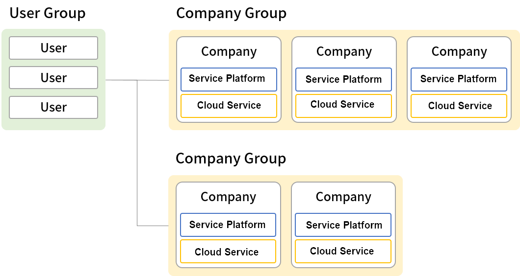 ユーザーの権限管理は、ユーザーグループ管理で行います。ユーザーグループにカンパニーグループを接続してユーザーグループ内のすべてのユーザーの権限を一括適用できます。ユーザーグループには、複数のカンパニーグループを接続することができ、ユーザーグループのユーザーはカンパニーグループに含まれている会社のサービス及びメニュー別の権限、クラウドアカウントに対する権限を持つことになります。
