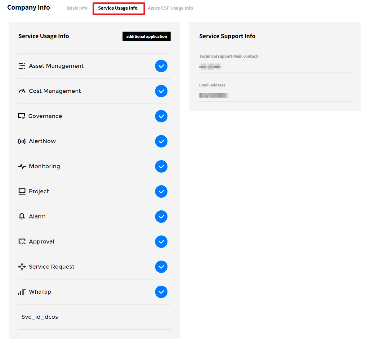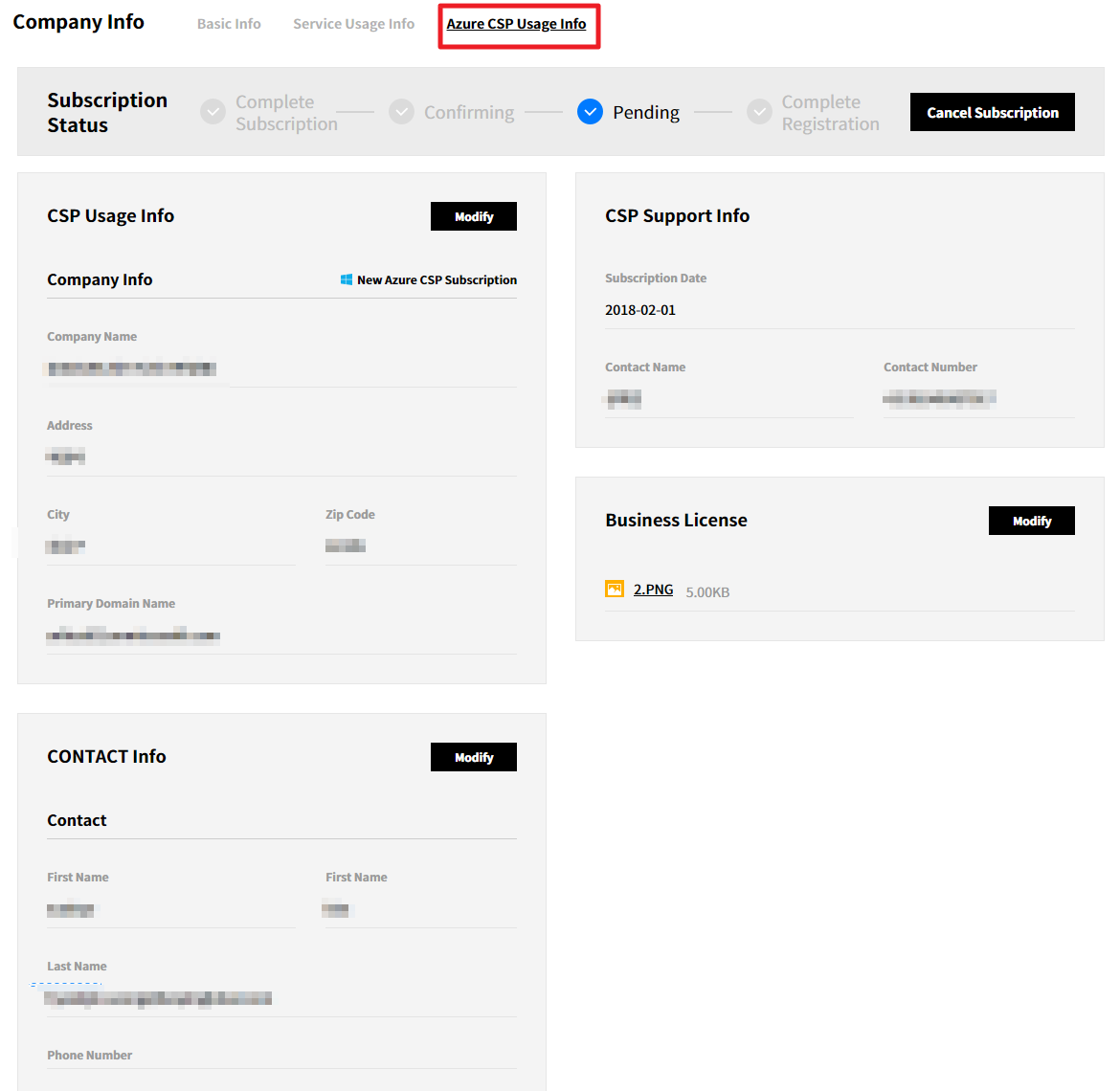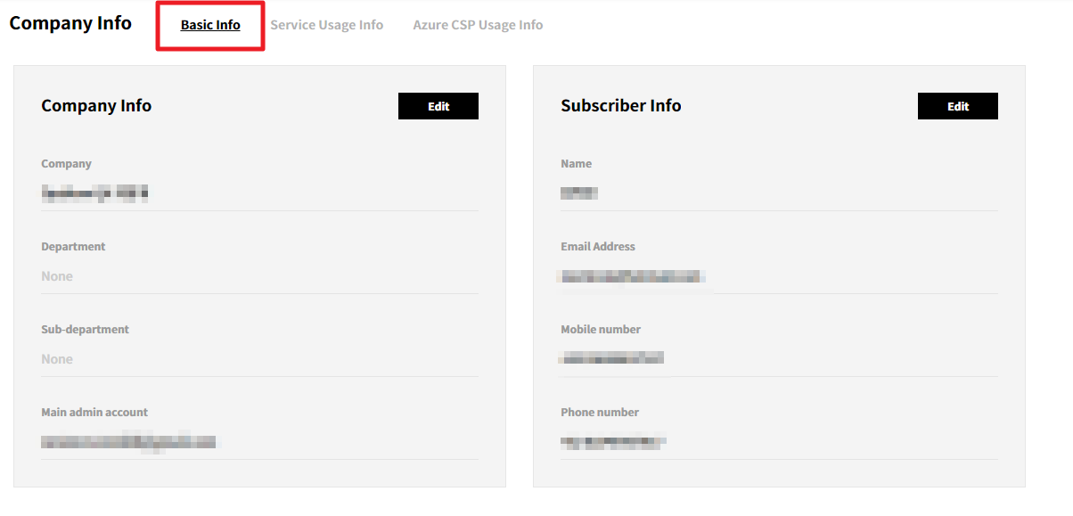 On this page, you can check Company’s basic information, Service usage, Azure CSP Usage, and Payment information.