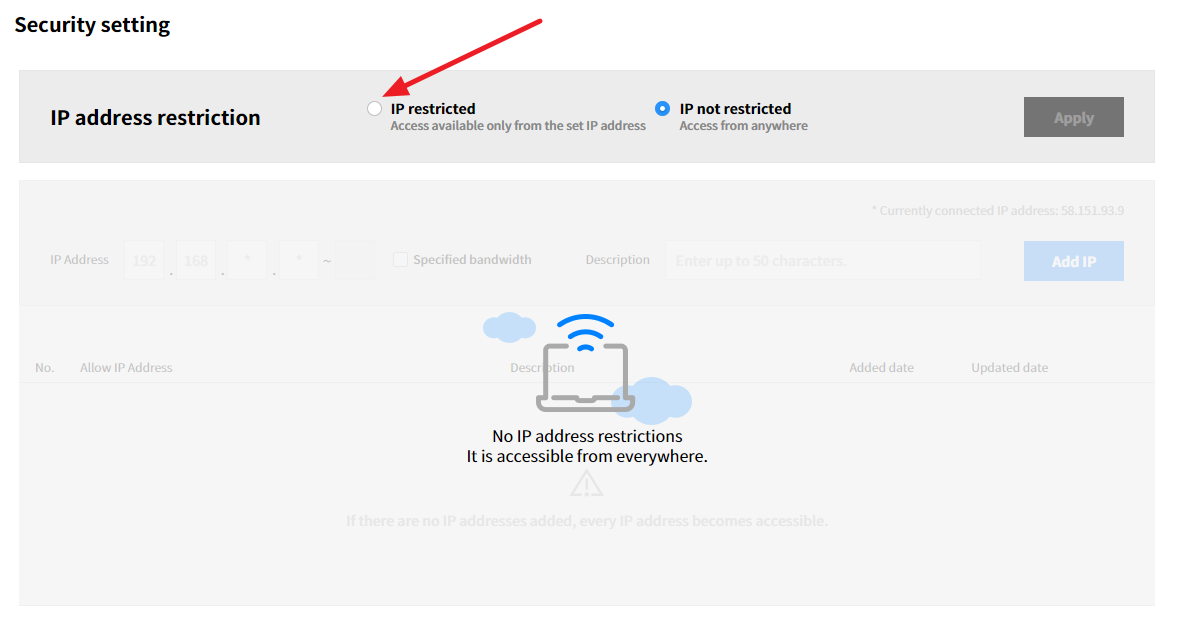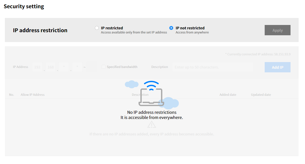 Restricting IP address feature is only for Admin users and must set this feature enabled on your PC. To register IP address, please contact our support team.