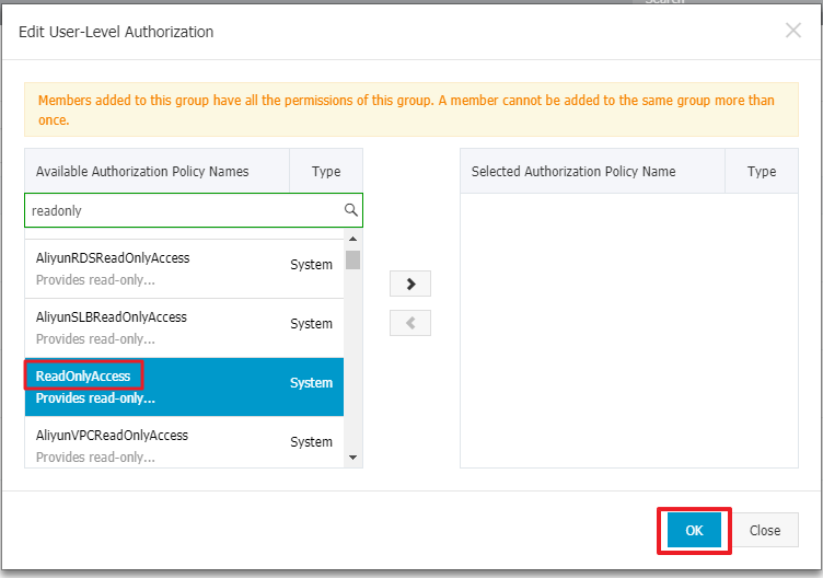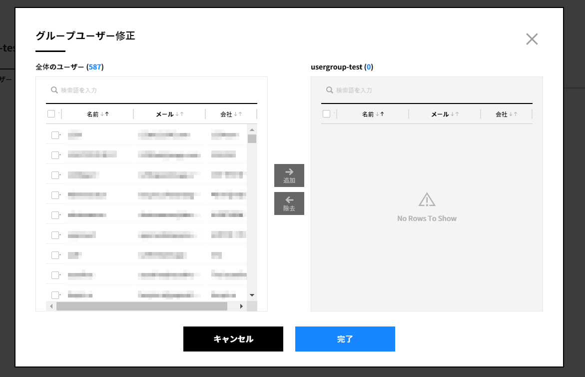 ポップアップの左側のリストには、現在の会社に加入された全体のユーザーが表示され、右側のリストには選択したユーザーグループに追加されたユーザーが表示されます。左側のリストで追加するユーザーを選択してから[追加]ボタンをクリックして追加する、または右側のリストでユーザーを削除しようとする場合、ユーザーを選択してから[除去]ボタンをクリックします。