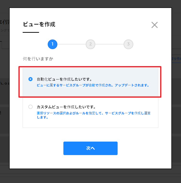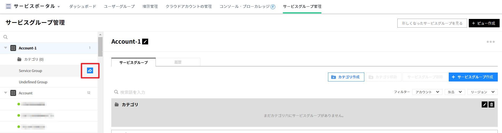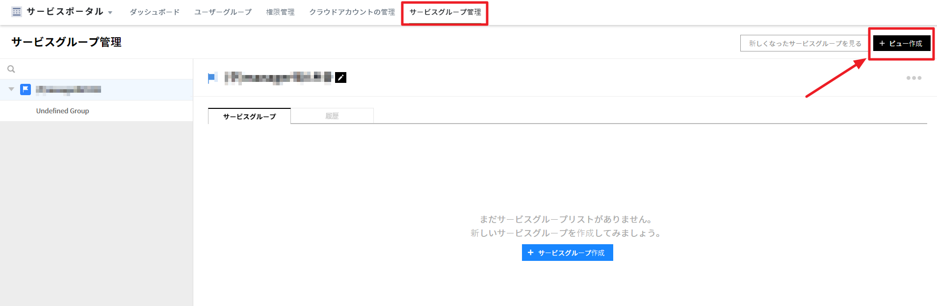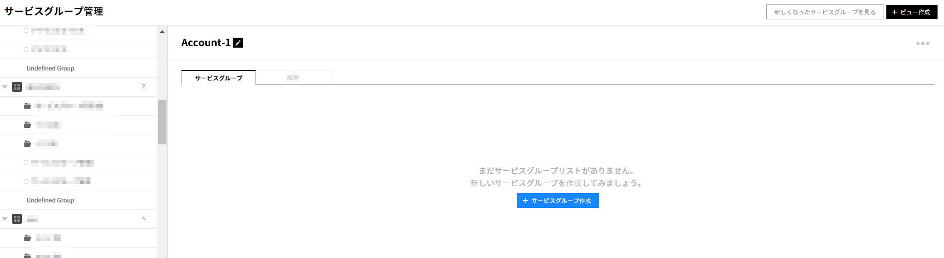 作成されたビューは、左側のメニューで確認できます。手動で作成されたビューのため、最初に登録されたサービスグループなしで作成され、サービスグループ作成ボタンで登録できます。