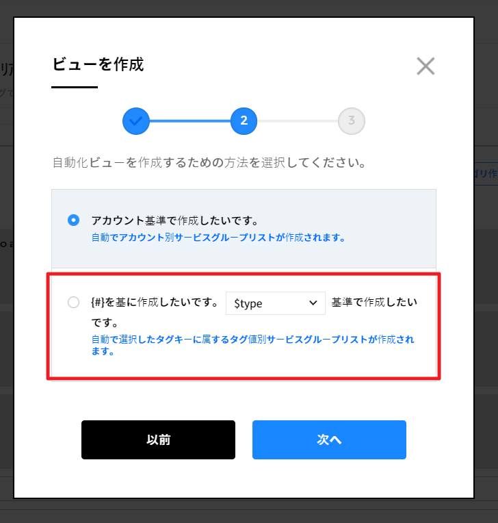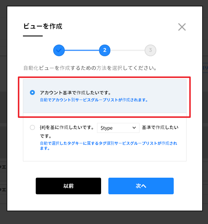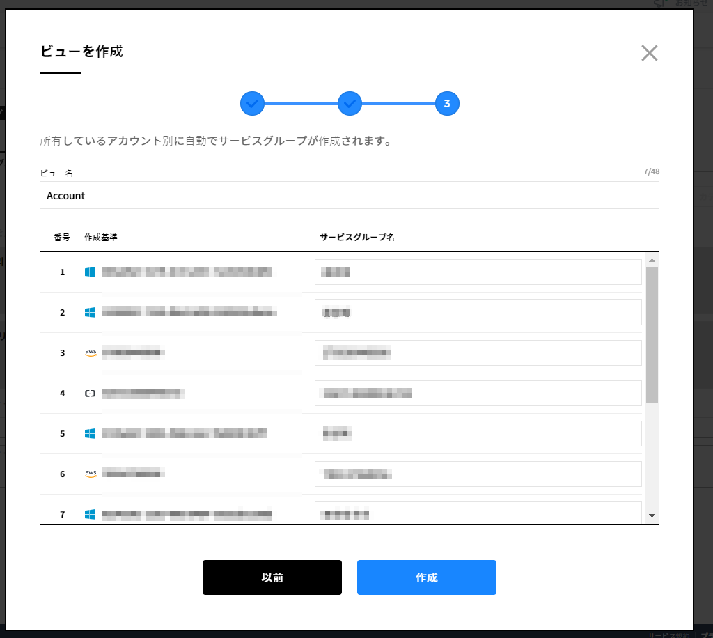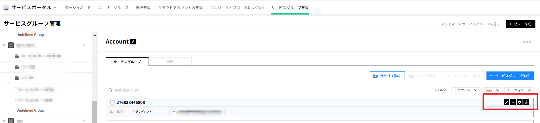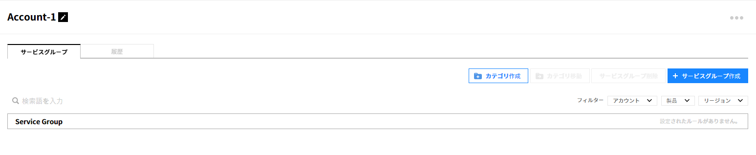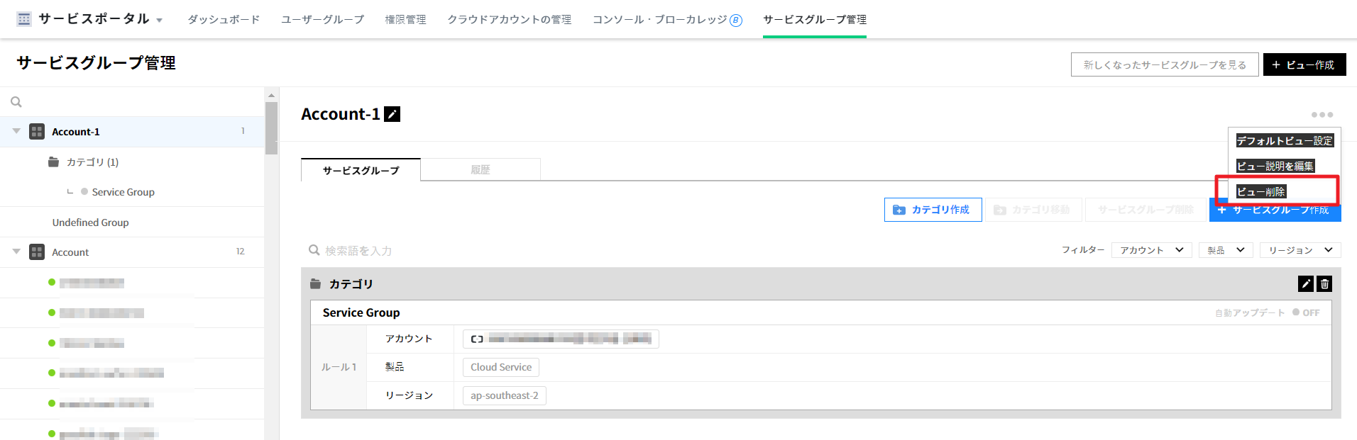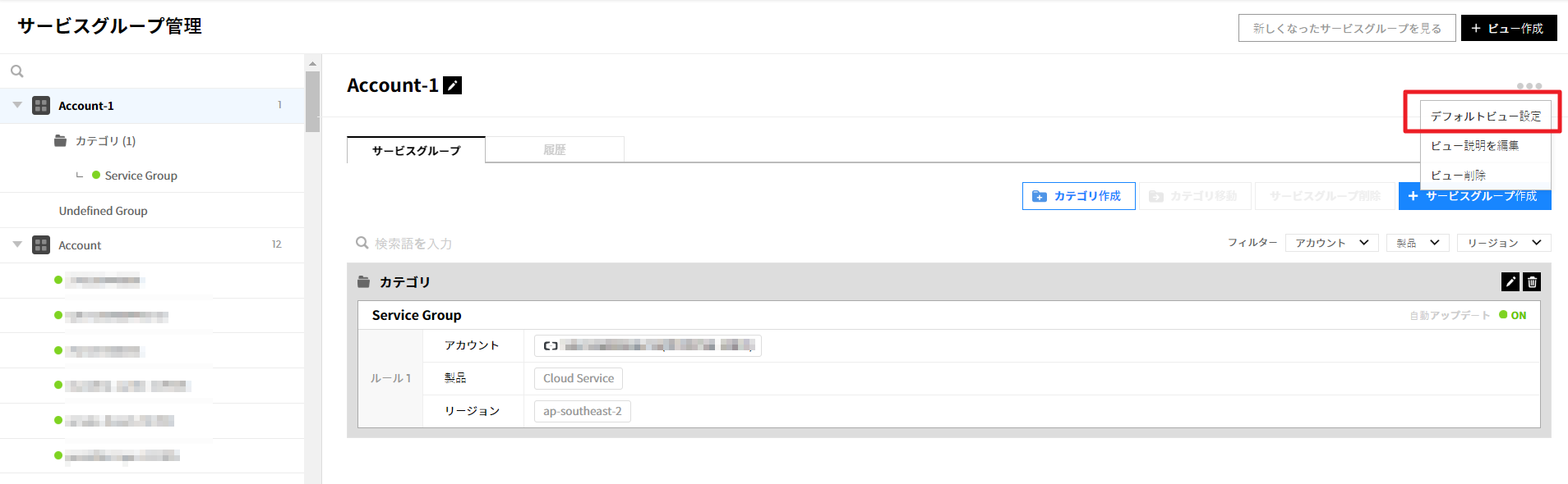 作成完了時、左側のメニューでビューの情報を確認でき、ビューを選択すると右側に自動で作成されたアカウント基準のサービスグループリストとサービスグループが作成されたルール条件を確認できます。