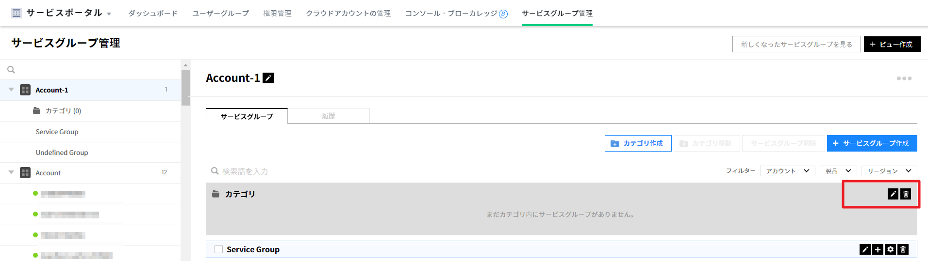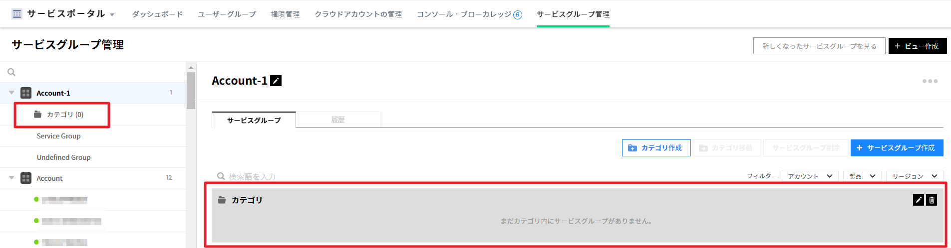 カテゴリー作成時、左側のビューリストにカテゴリー形のアイコンと右側のサービスグループリスト画面にカテゴリーが作成されていることを確認できます。