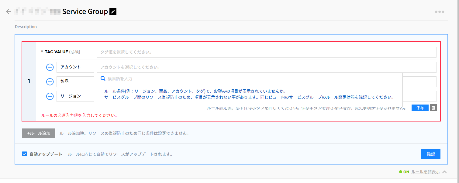 [新規ルール追加]ボタンを選択すると、リストが拡張され設定オプションが表示されます。既に設定された条件がある場合は共に表示され、タグ値の条件が選択されてない、または重複した条件が他のサービスグループに設定されている場合、アラートメッセージが出力され保存されません。