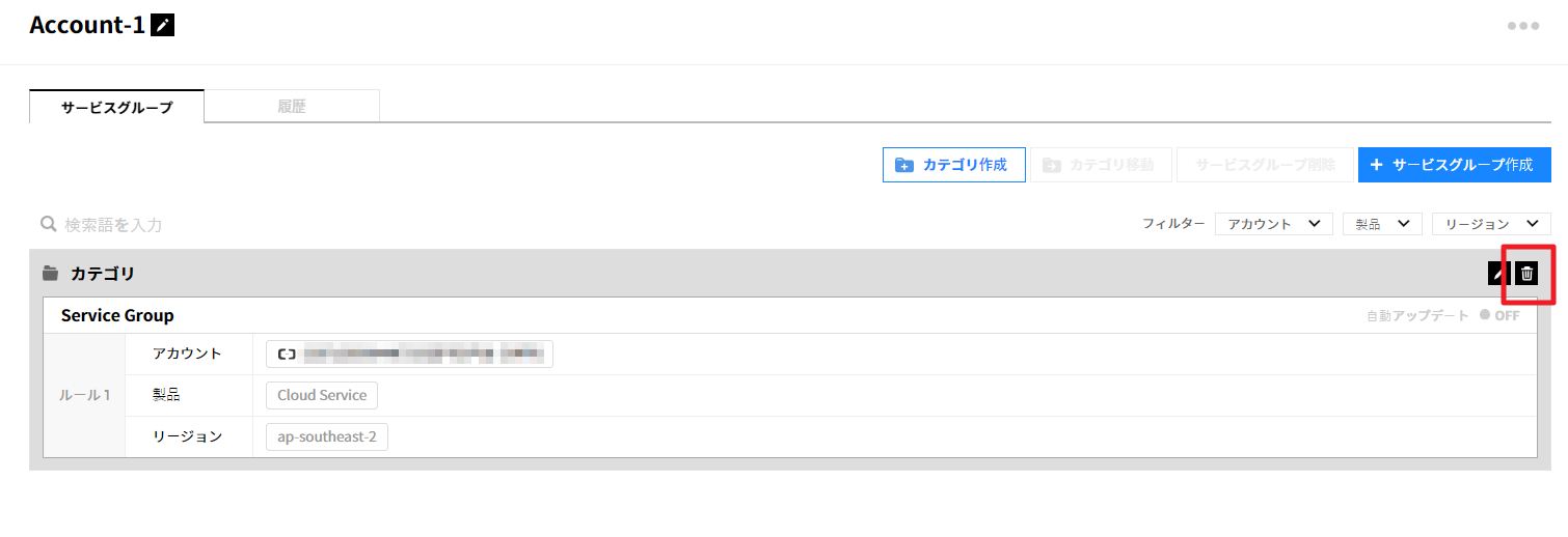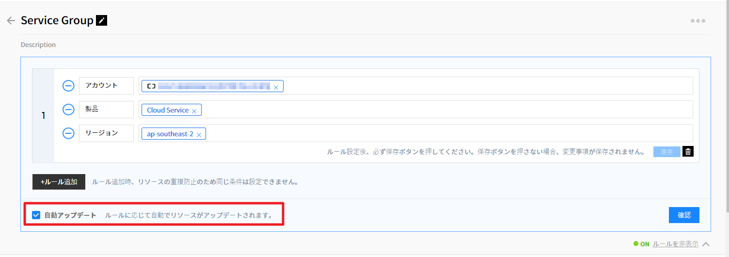 ルールを削除しなくても自動アップデート機能をOn/Offすることでサービスグループがルール条件の影響を受ける、または受けないように変更できます。