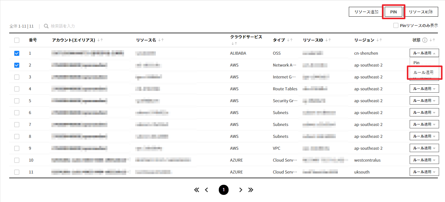 PIN処理するリソースをチェックして一度にPIN処理することができます。ステータス項目で個別にPIN処理できます。